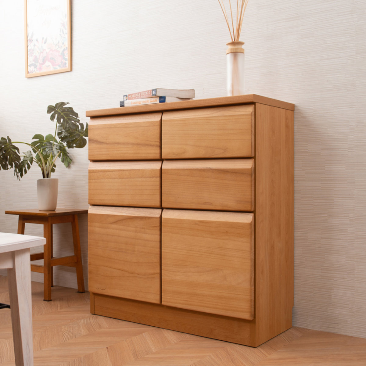 上2段(4杯)の引出しと、下段の扉式に分けて収納できます。扉内は、A4の大判ファイルもスッポリと収納できます。雑誌や本、普段使う散らかりがちな雑貨などを隠して整理ができます。