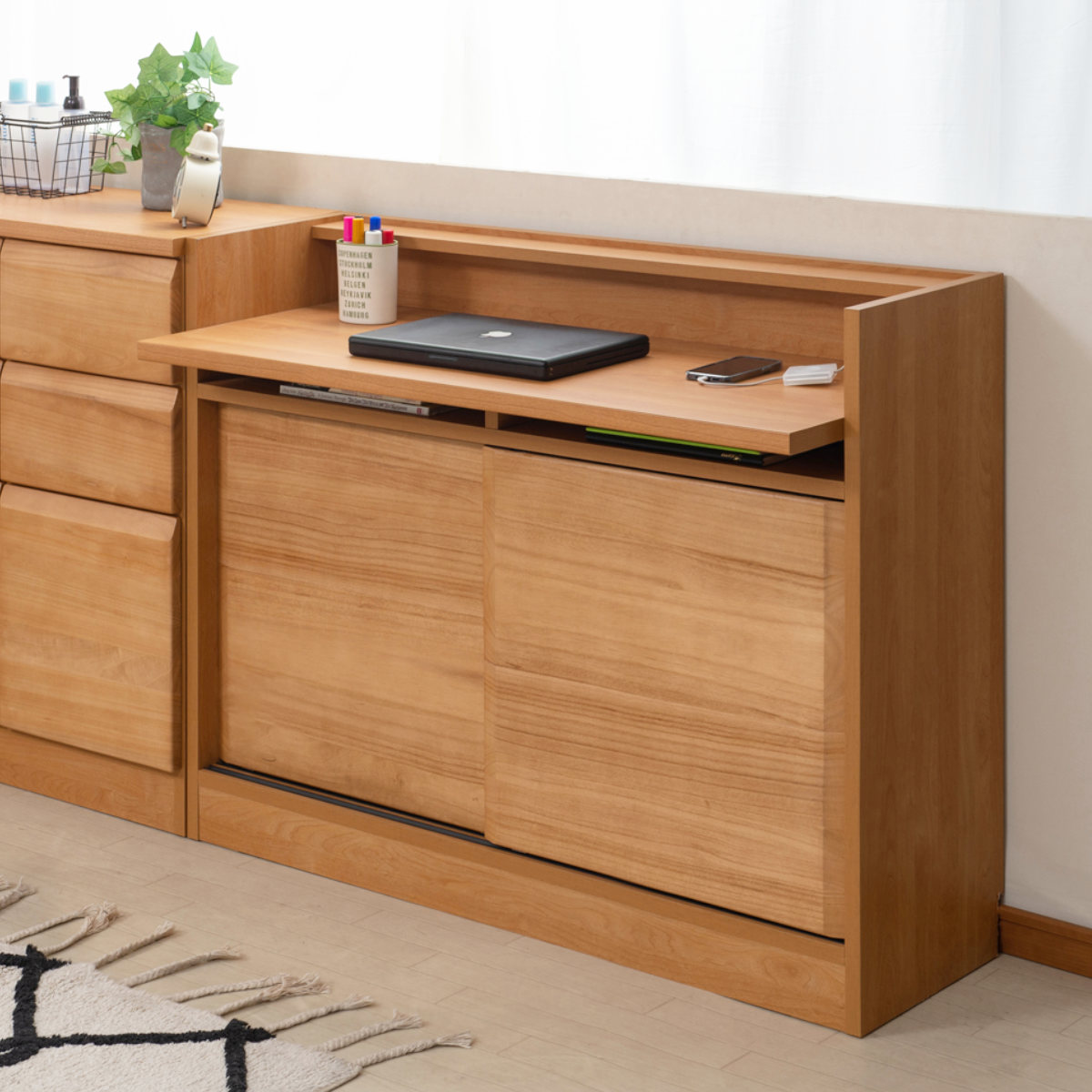 ノートパソコンや書類を収納するスペースがあり、スムーズに出し入れができます。また、引き戸式の扉は、座ったままでも扉の開閉ができ、中にはたっぷり収納ができます。