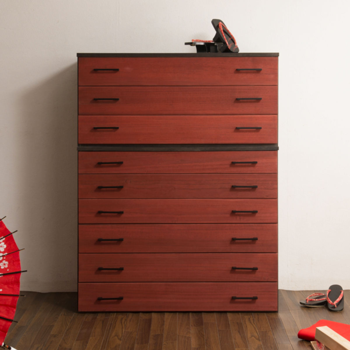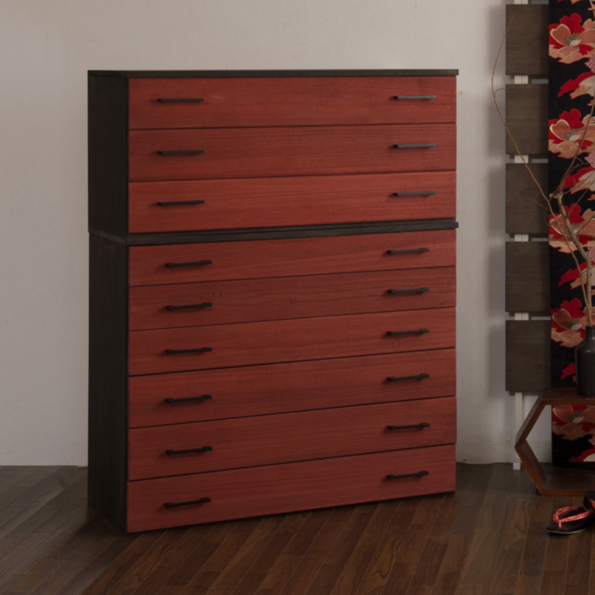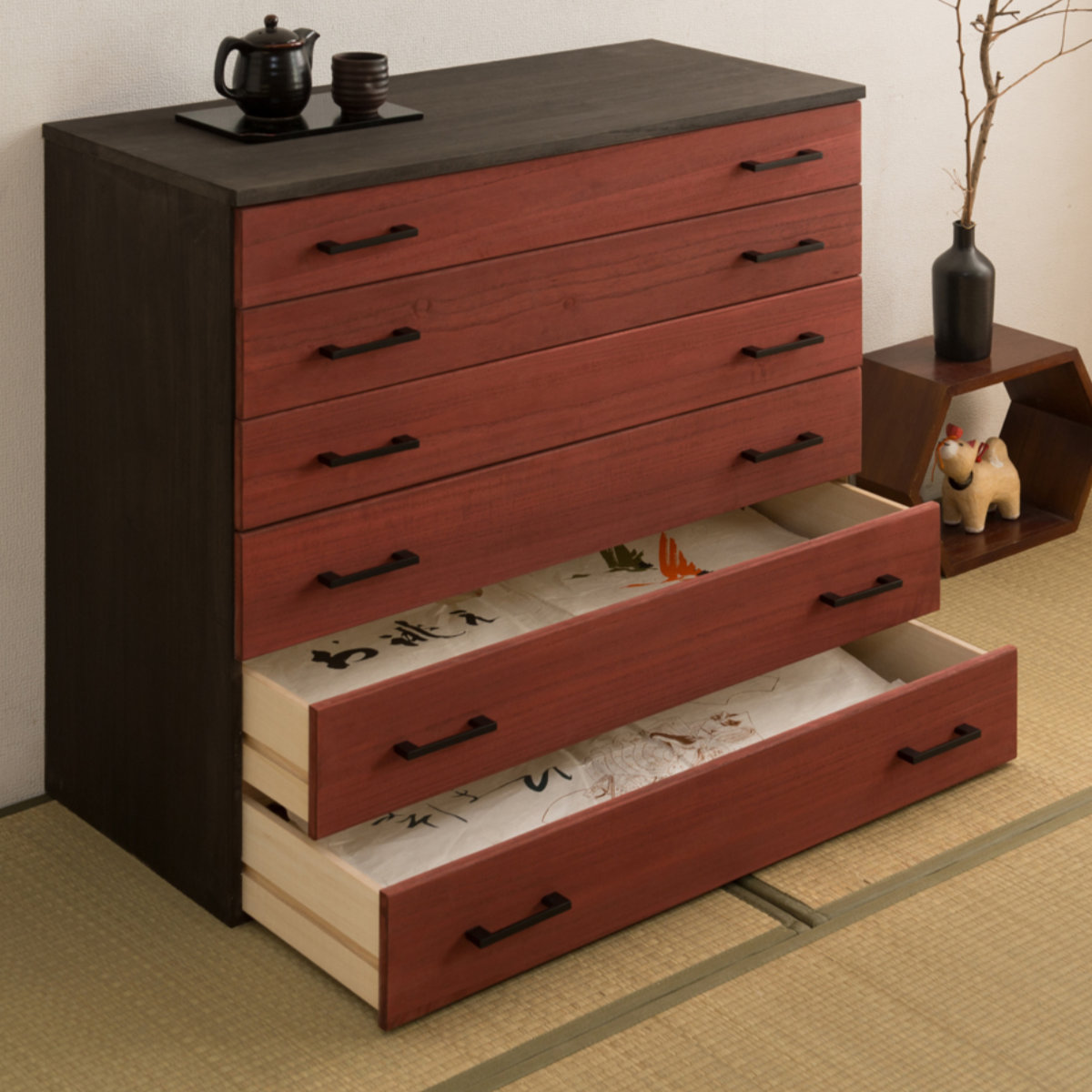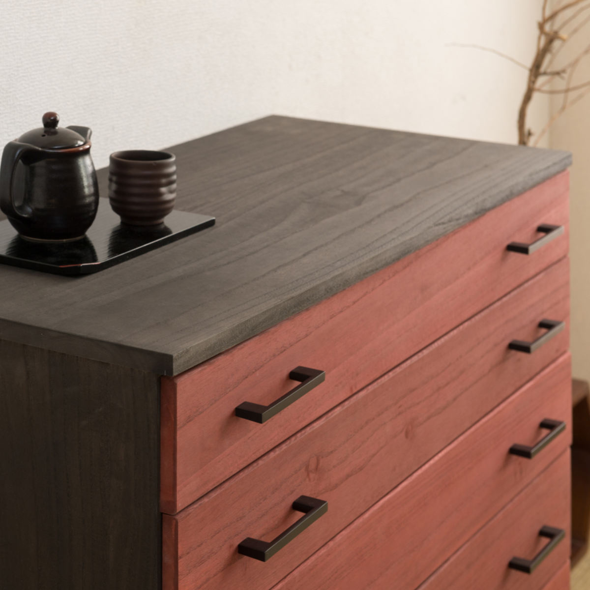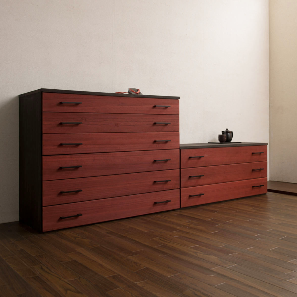 ダークブラウンの本体と深みある朱の前板の組み合わせが個性的な本格派桐タンスです。和の域にとどまらず、インテリアをより魅力的にする現代風のデザインです。