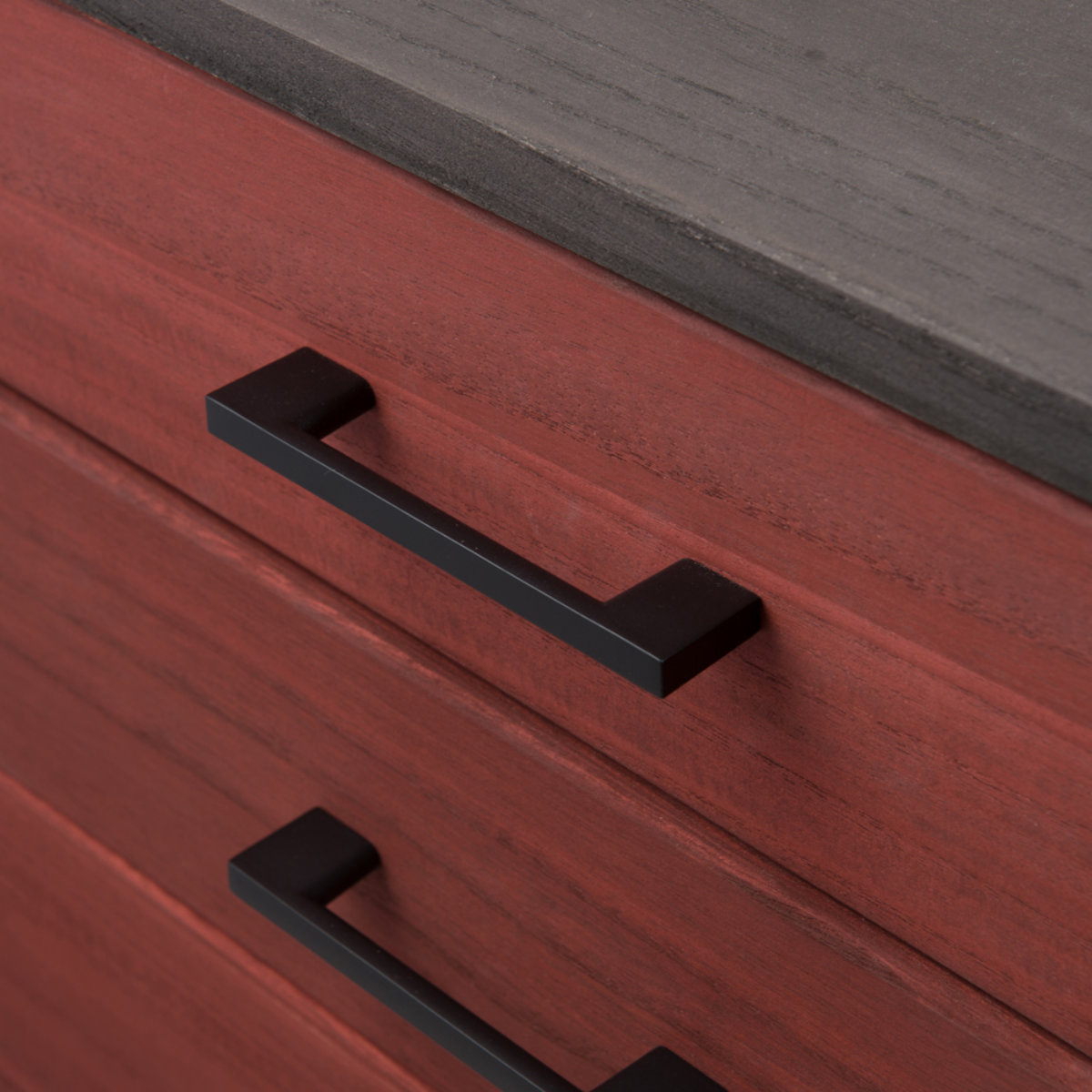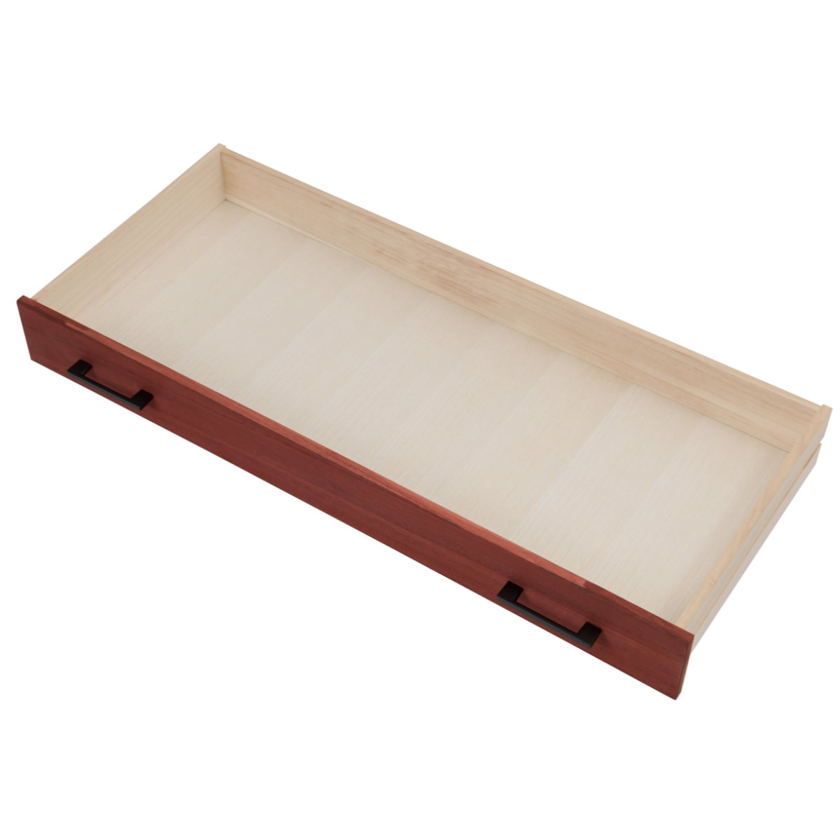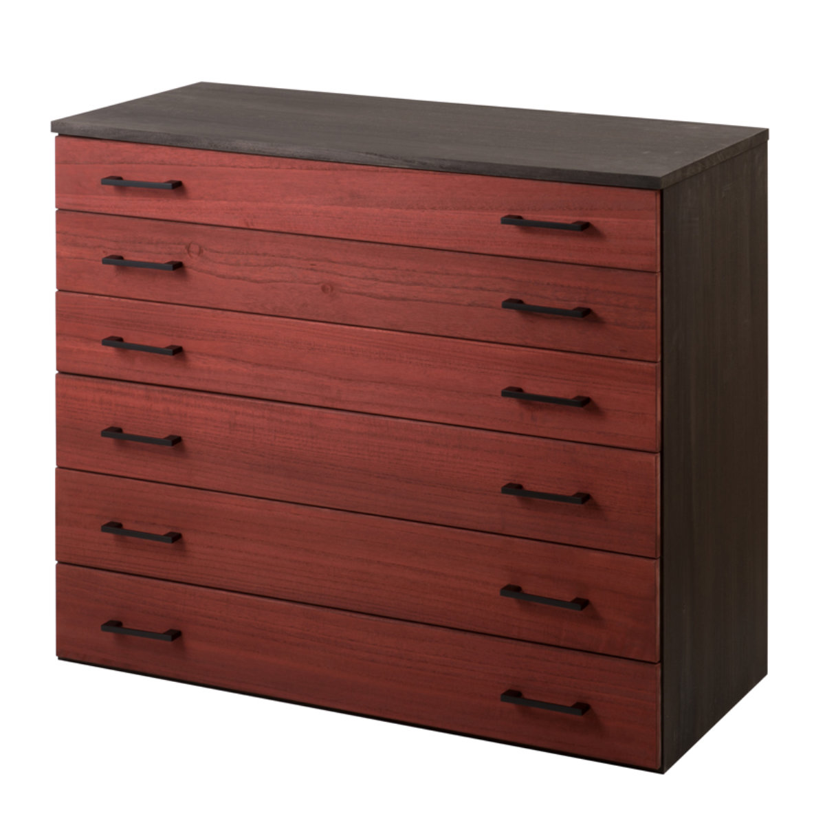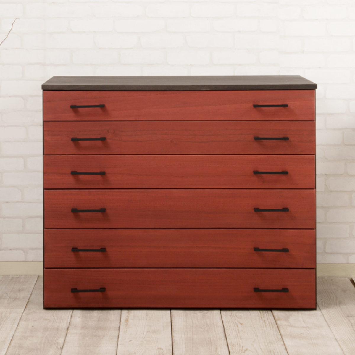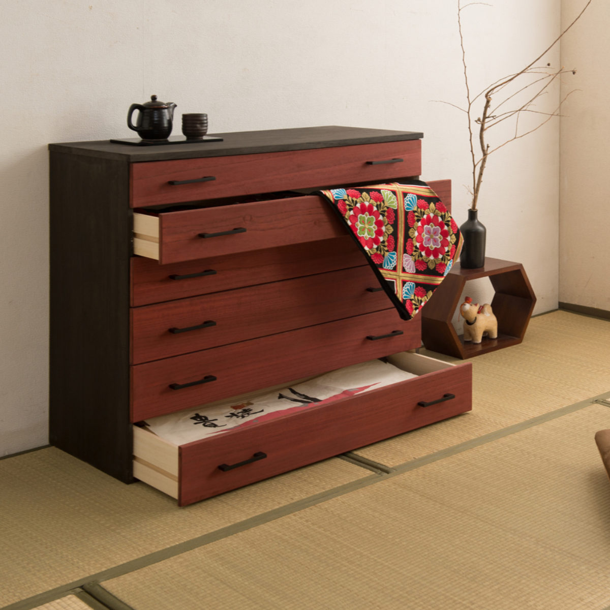 ダークブラウンの本体と深みある朱の前板の組み合わせが個性的な本格派桐タンスです。和の域にとどまらず、インテリアをより魅力的にする現代風のデザインです。