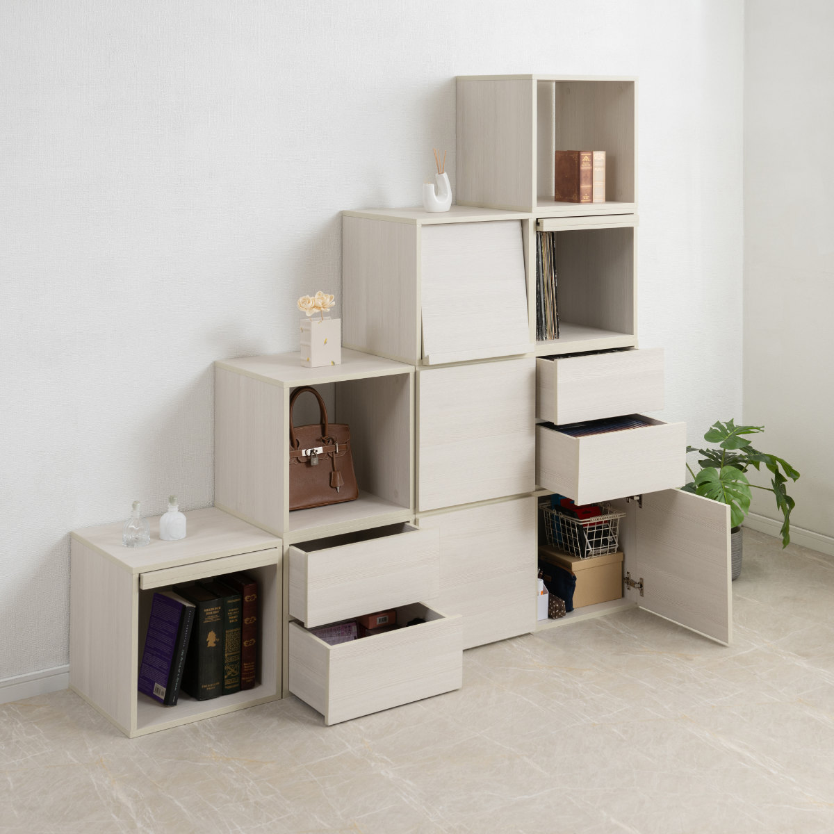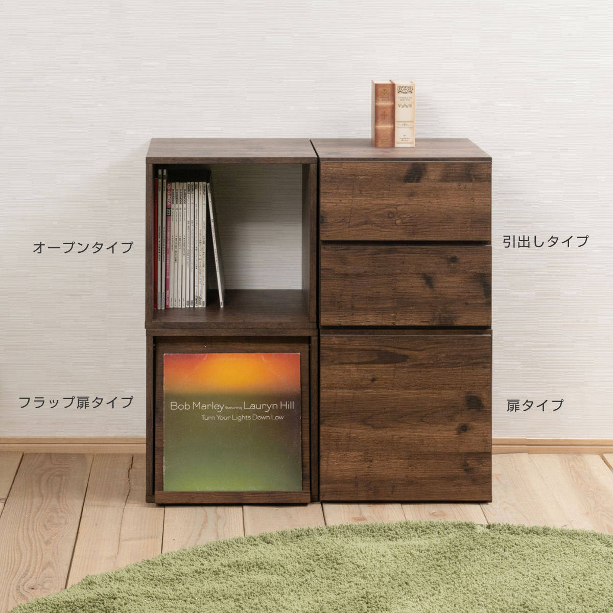 4種類のボックスを自由に組み合わせて、お好みの収納を作ることができるユニットボックス「フラップ扉タイプ」です。同じシリーズのボックスは、全て39cm角なのでどの組み合わせでもぴったりと揃い、お好きなレイアウトを楽しめます。