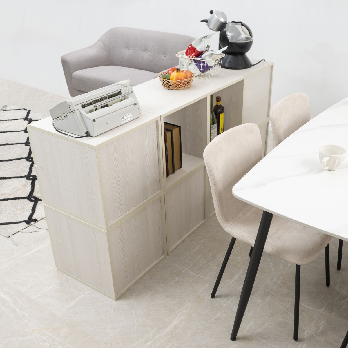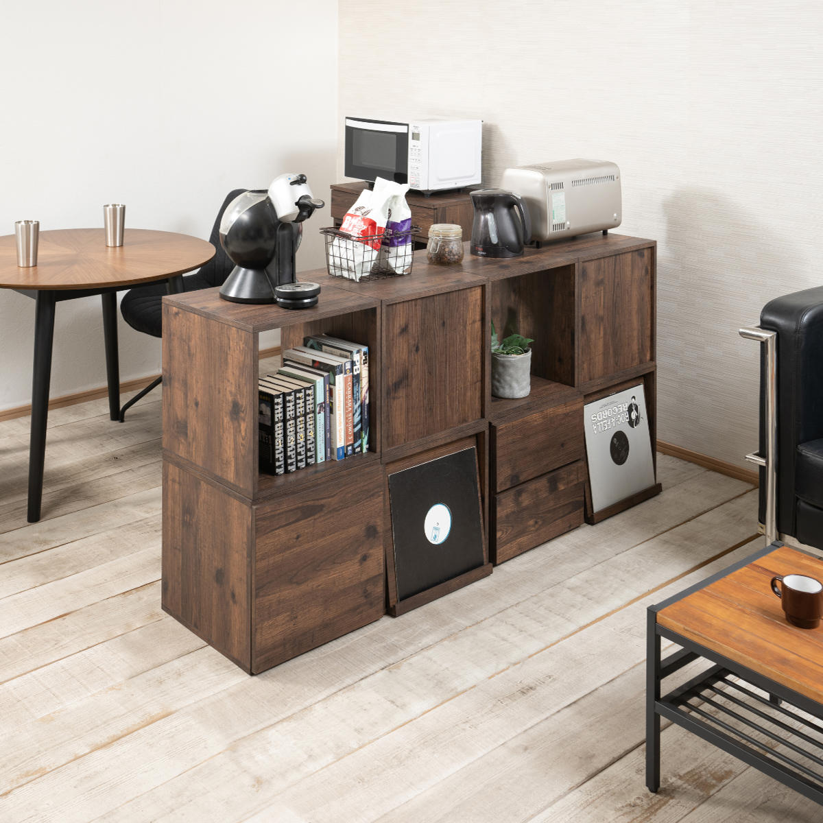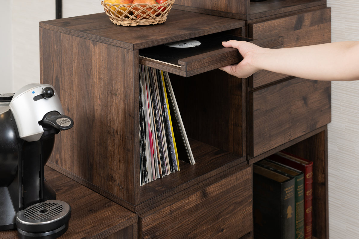 キャビネットやローボード、階段型やデスクサイドのラックとしてなど、アイデア次第でオリジナルの家具が完成します。連結金具で繋げるだけなので、ライフスタイルの変化に合わせていつでも組み替えられます。