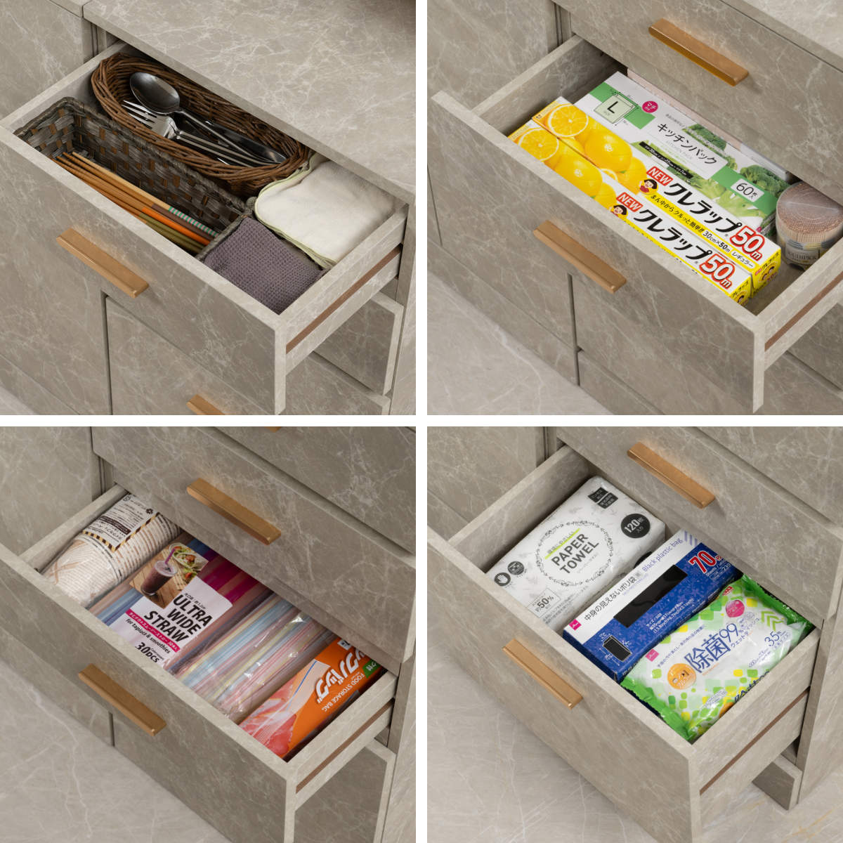 深型1杯を含む合計4杯の引出しがあります。1~3段目は深さ(有効)が11cmあり、カトラリーなどの小物をカゴに小分けして整理できます。キッチンペーパーなどのかさばるものは、4段目の深型に収納できます。収納力抜群なので、ラップなど消耗品のストック置き場としても最適です。