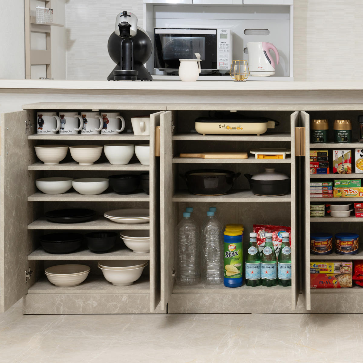 背面にも化粧仕上げが施されているので、お部屋の中央に置くこともできます。リビングとキッチンの間仕切りとしてお使いいただけます。