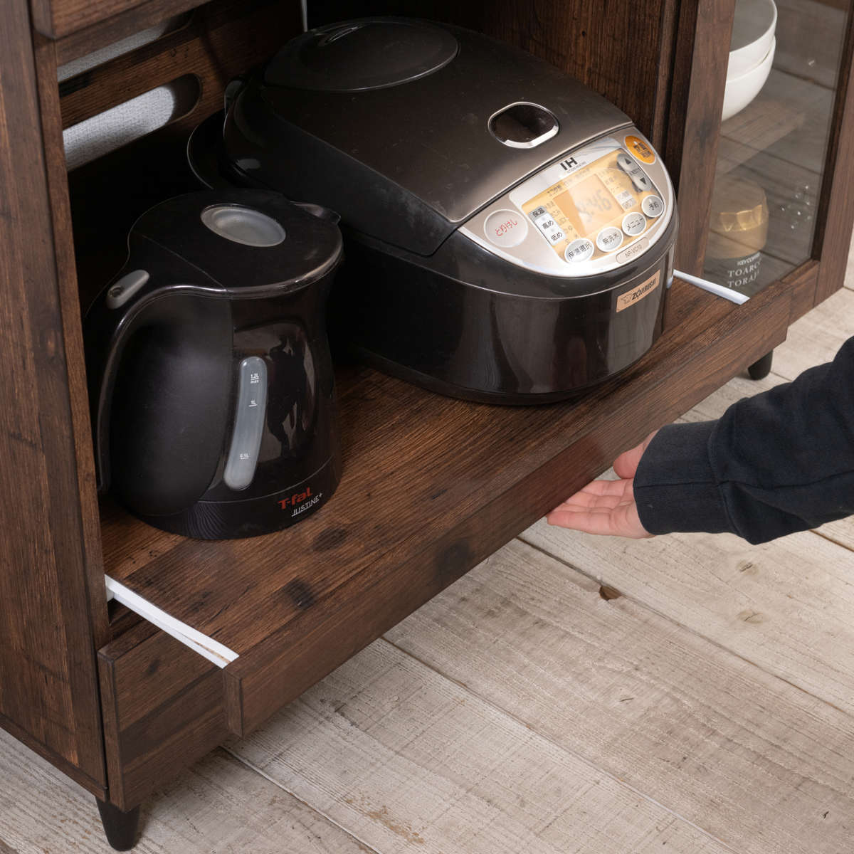 炊飯器やポットなど、蒸気が出る家電の設置にぴったりなスライド棚です。さっと引き出して使いやすく、蒸気を逃して湿気がこもるのを防止します。