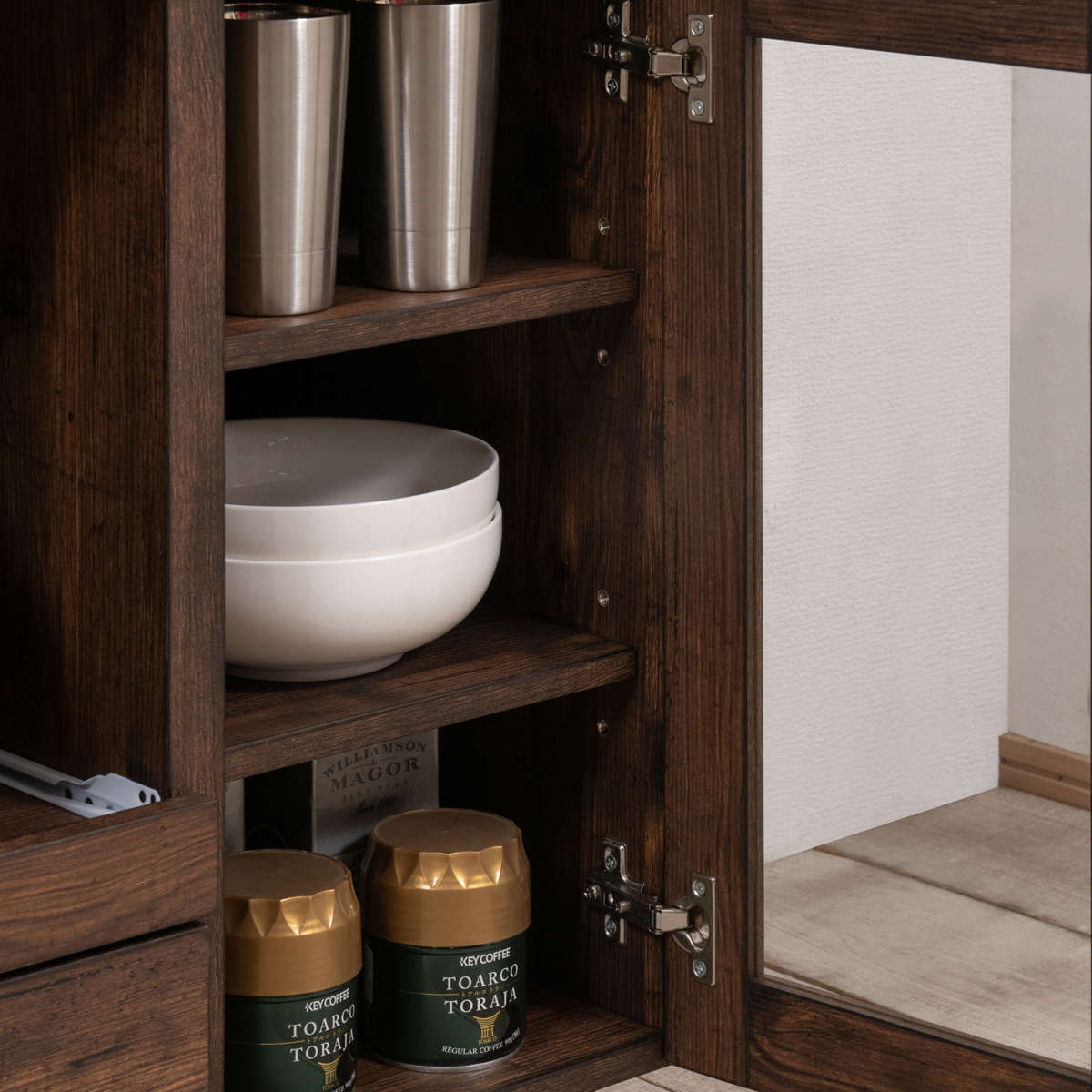 ガラス扉内には、食器などの収納物に合わせて高さを調節できる可動棚が付いています。スペースを無駄にすることなく収納できます。