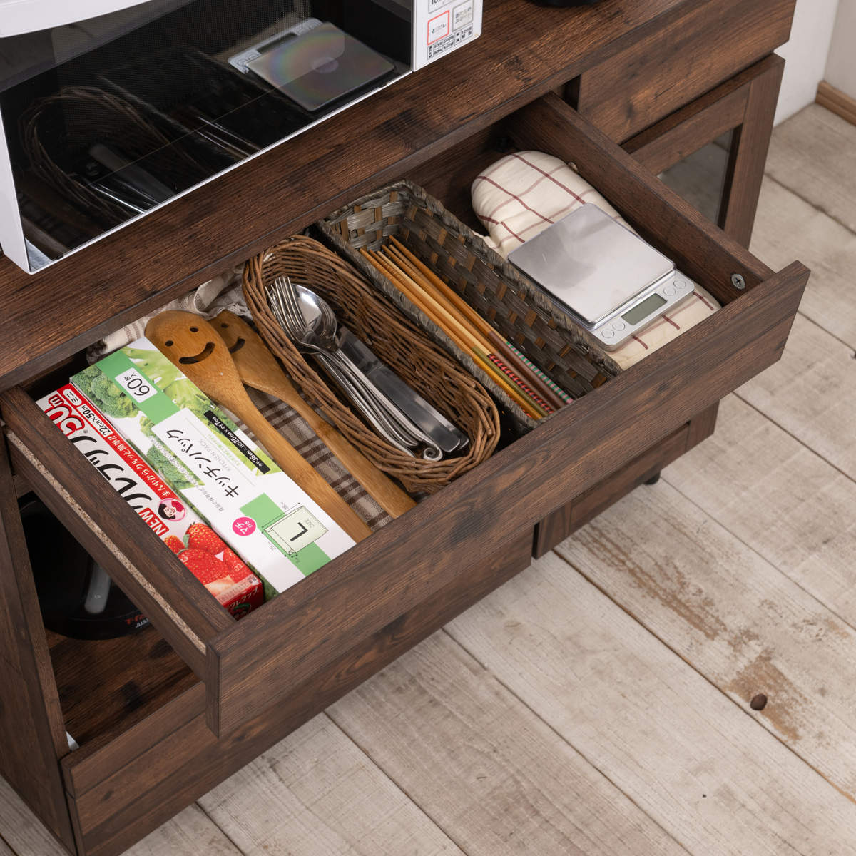 カトラリーや布巾など、キッチン雑貨の整理に便利な引出しが大2杯、小1杯付いています。引出しの下に手掛けがあり、取っ手のないスッキリとしたデザインです。