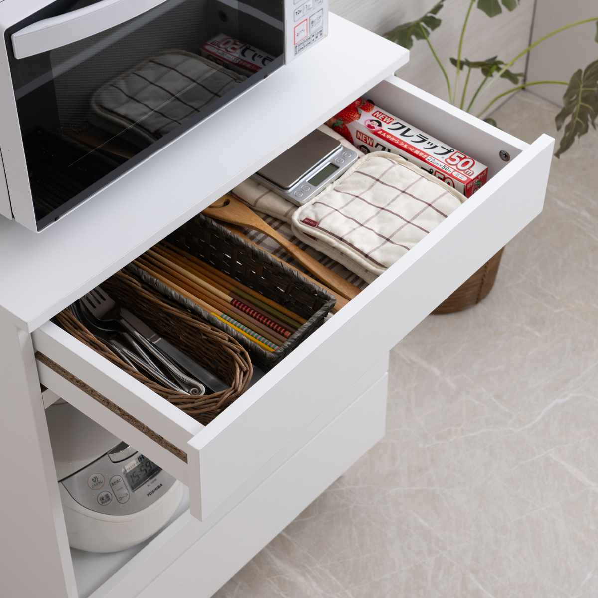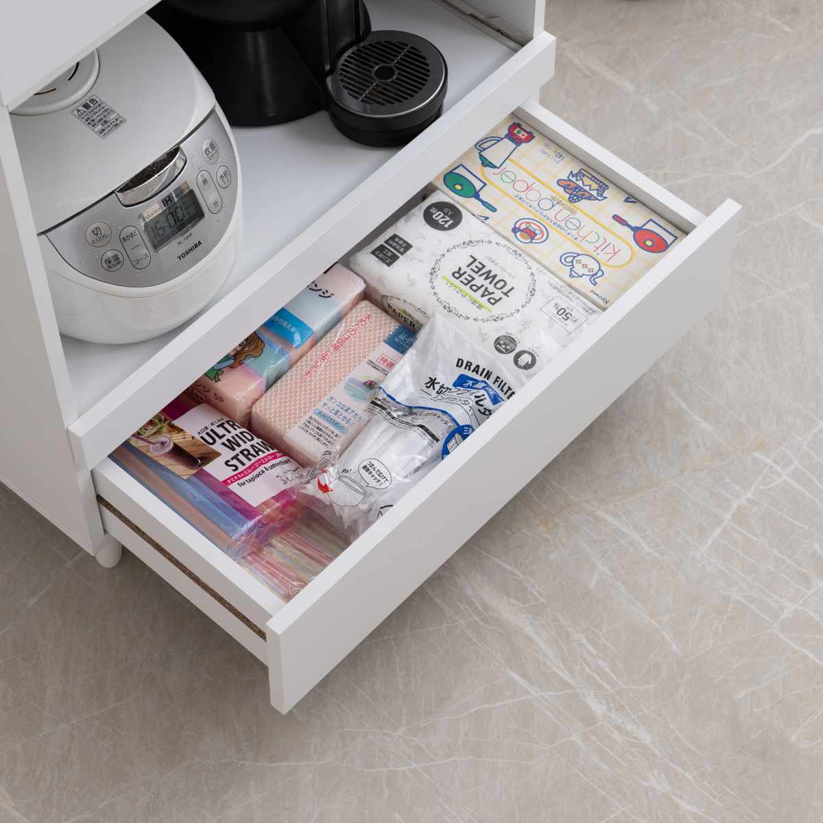 カトラリーや布巾など、キッチン雑貨の整理に便利な引出しが上下に2杯付いています。引出しの下に手掛けがあり、取っ手のないスッキリとしたデザインです。