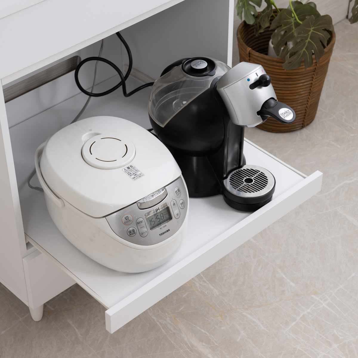 炊飯器やポットなど、蒸気が出る家電の設置にぴったりなスライド棚です。さっと引き出して使いやすく、蒸気を逃して湿気がこもるのを防止します。