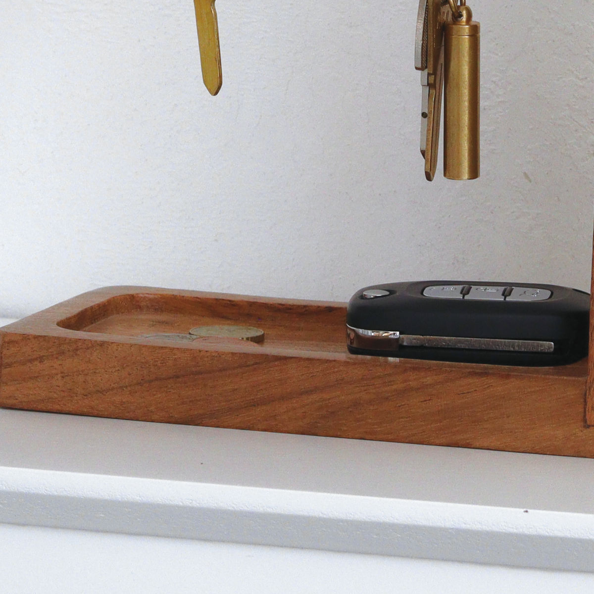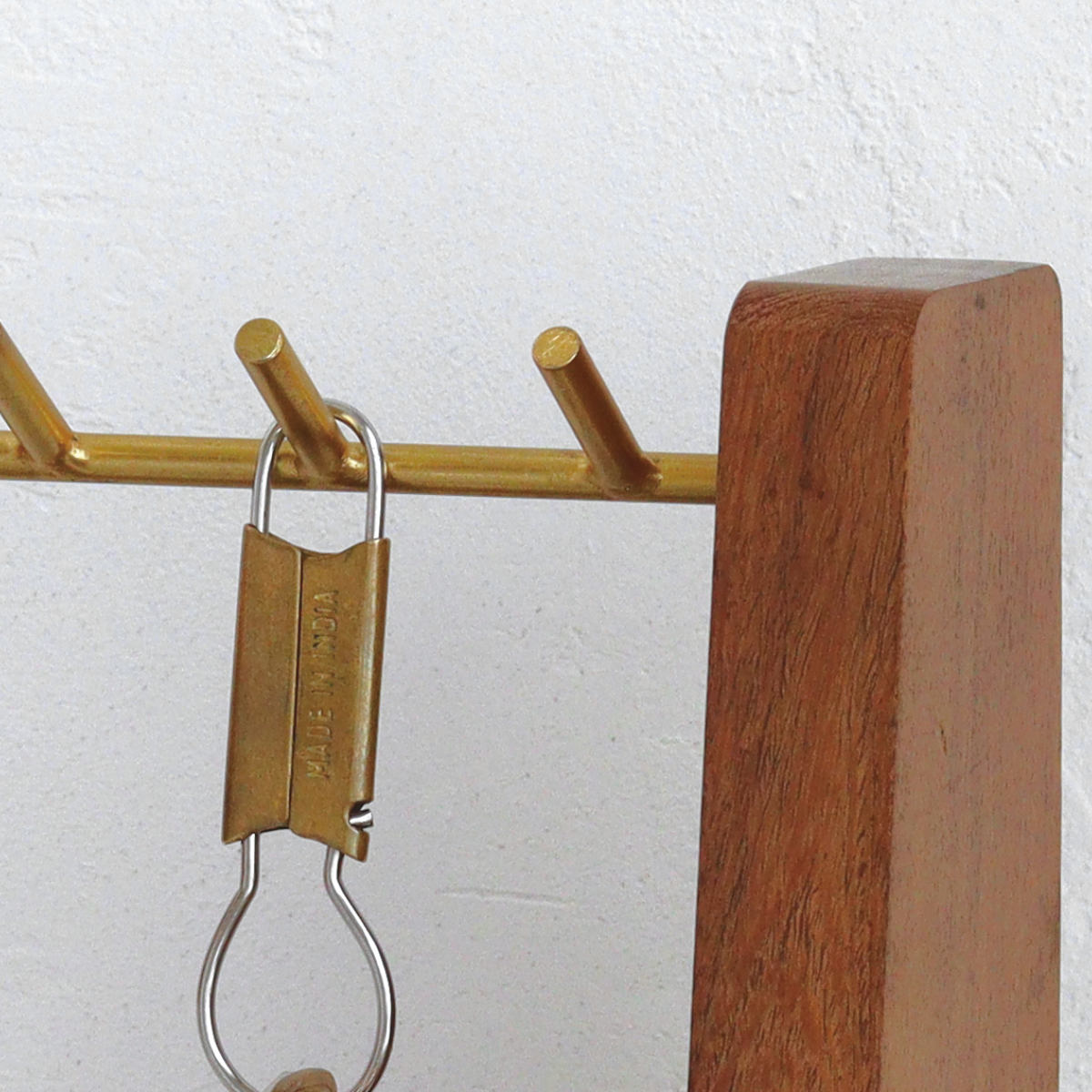 温もりのある木製の土台と、上品な真鍮のバーを組み合わせた、シンプルでスタイリッシュなキースタンドです。土台部分には車の鍵や小物を置けるスペースを確保でき、バーには鍵やマスク、アクセサリーなどを掛けられ、外出時の必需品をすっきりまとめて収納できます。