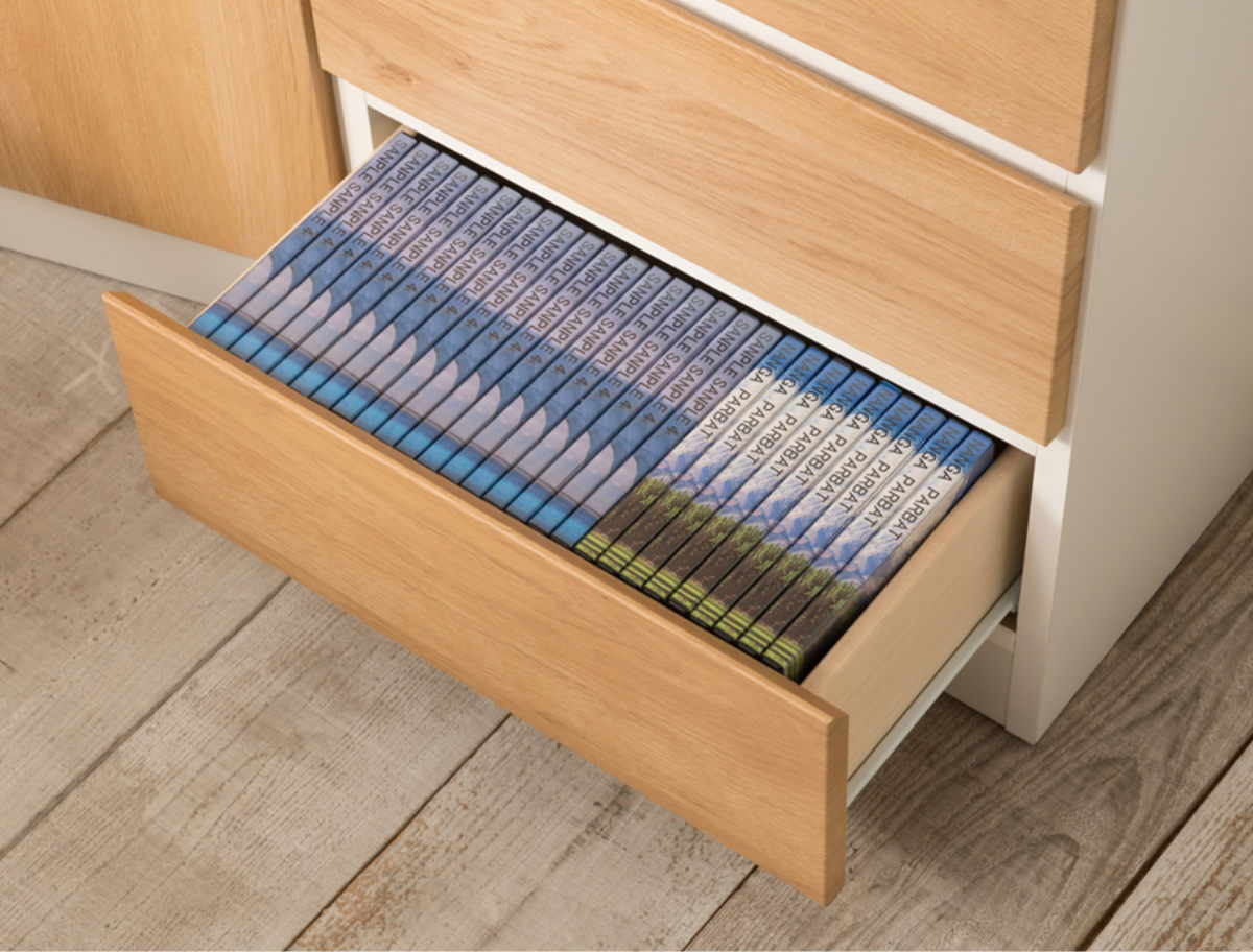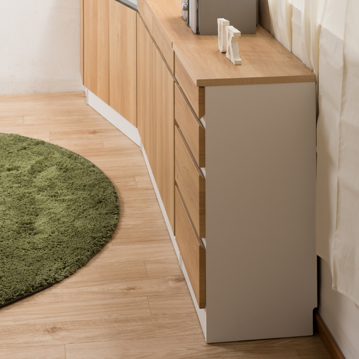 カウンター下にちょうど収まる高さのスリムチェストです。同じシリーズのキャビネットなどと組み合わせば、まるで造り付けのような一体感です。キッチンやカウンター下だけでなく、玄関やリビングでのちょっとした収納として使用できます。