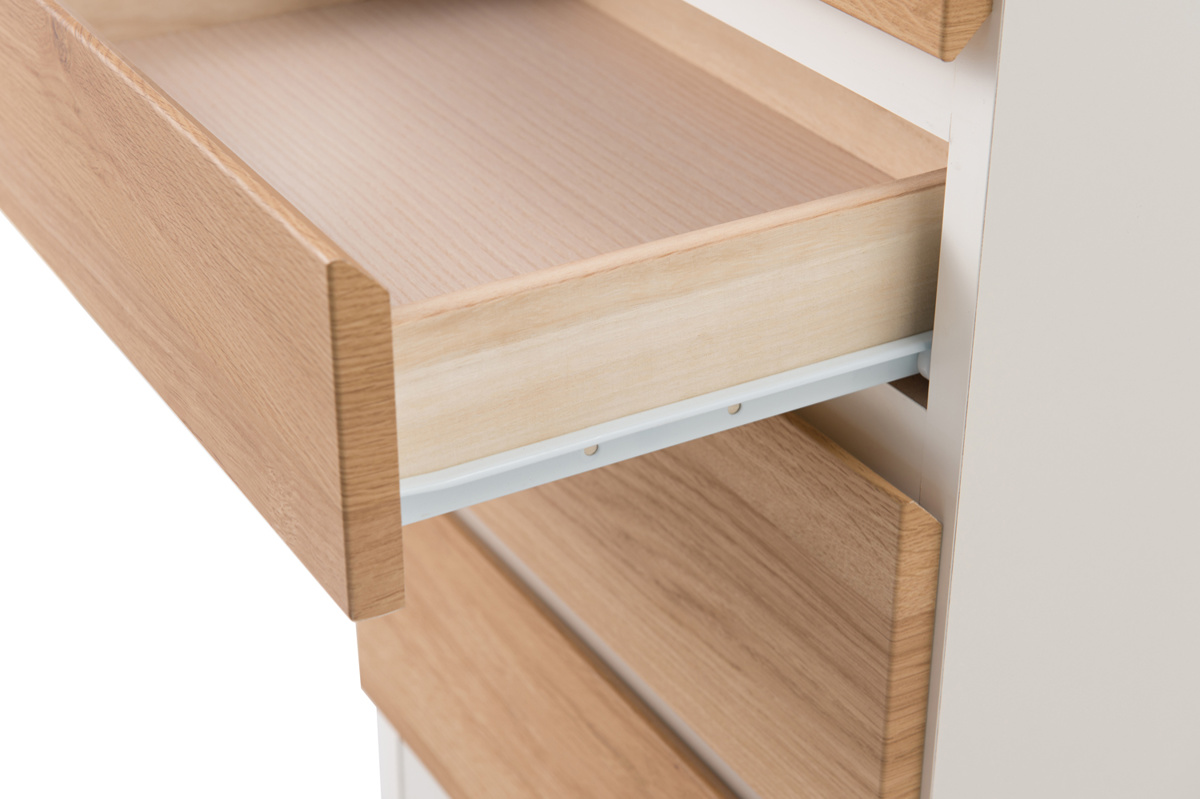 最上段以外の引出しはスライドレール仕様で、スムーズに開閉できます。抜け落ち防止のストッパー付きで安心です。