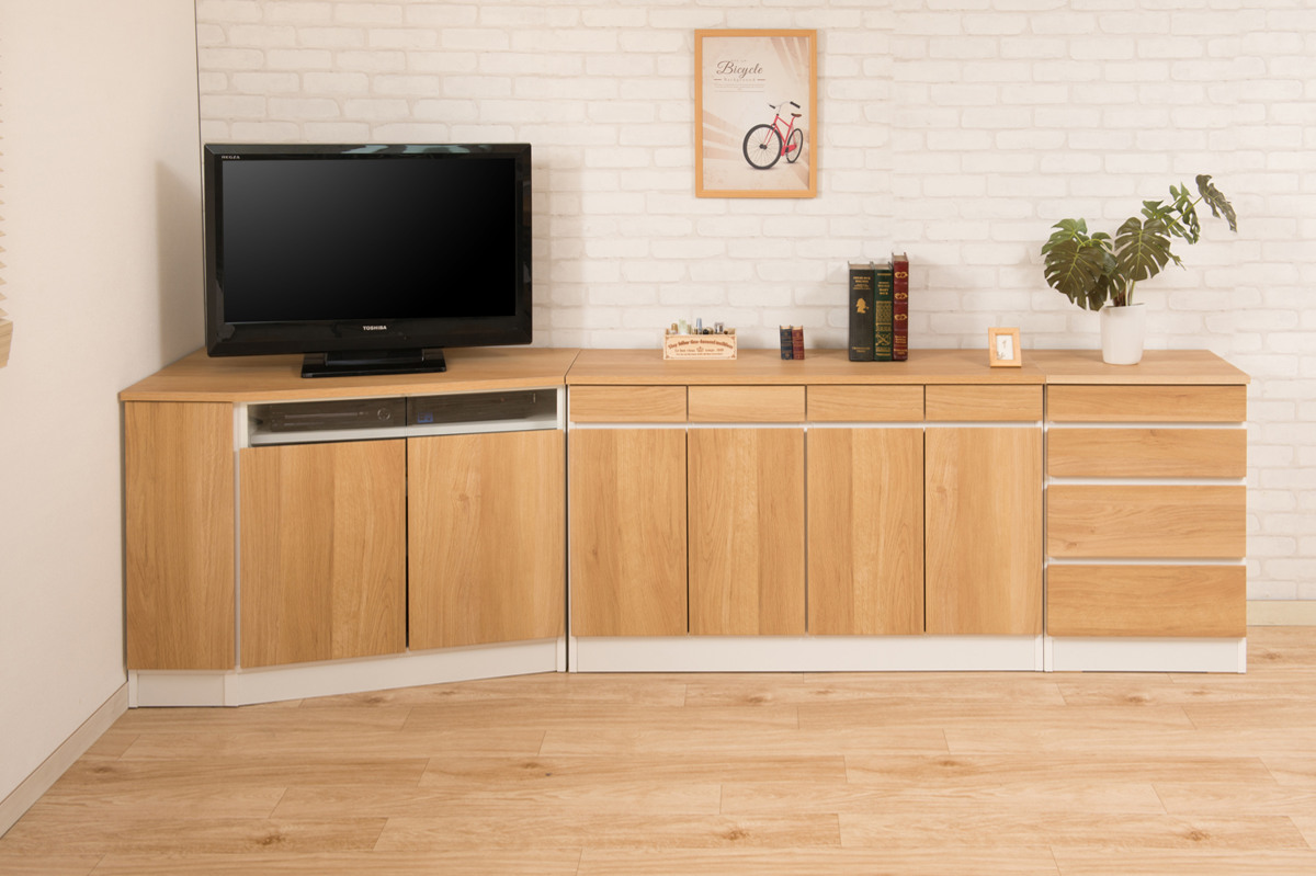 お部屋のコーナーを有効に使えるカウンター下収納、GYM(ジム)シリーズ。シンプルな中に、少しこだわりをアクセントにスパイスを効かせたナチュラルなデザインです。ホワイトのベースにリアルな木目調のシートを貼り、清楚な高級感を生み出しています。