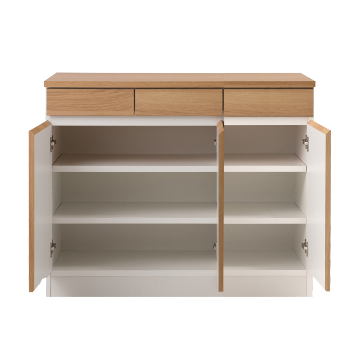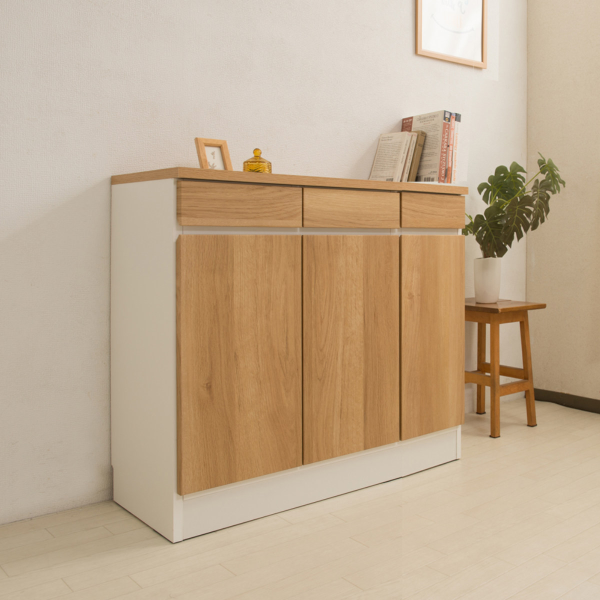 カウンター下にちょうど収まる高さのリビングボードです。同じシリーズのキャビネットなどと組み合わせば、まるで造り付けのような一体感です。キッチンやカウンター下だけでなく、玄関やリビングでのちょっとした収納として使用できます。
