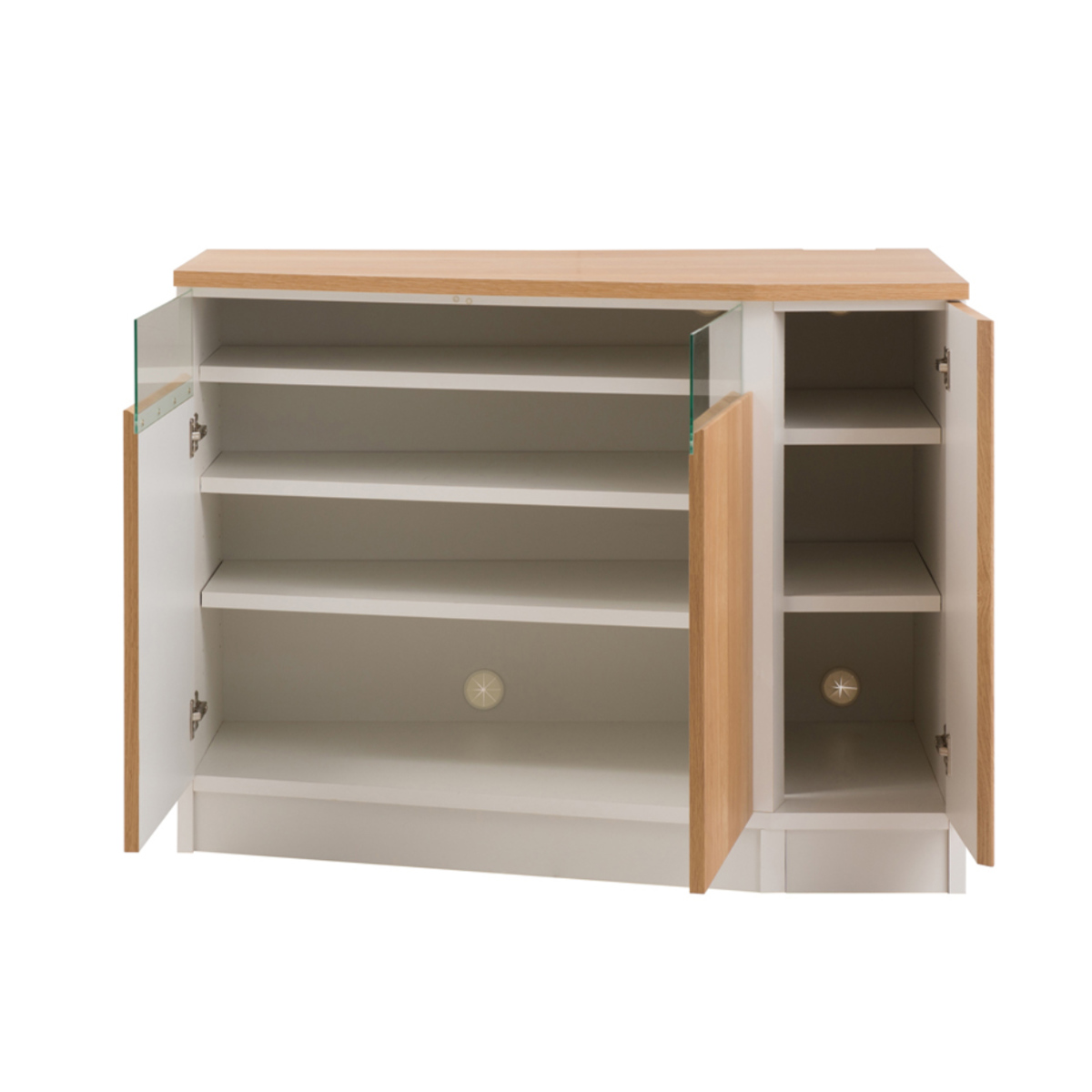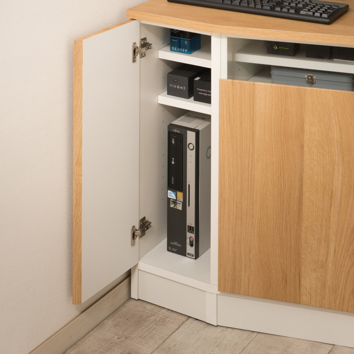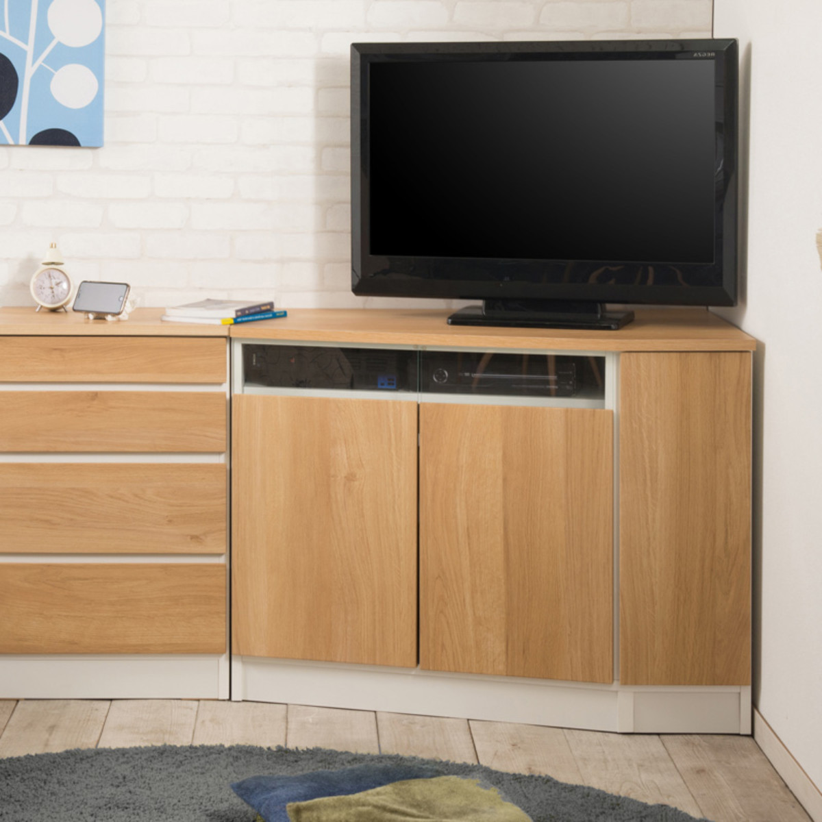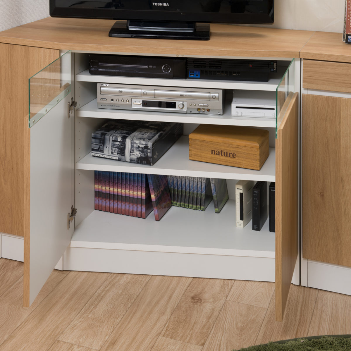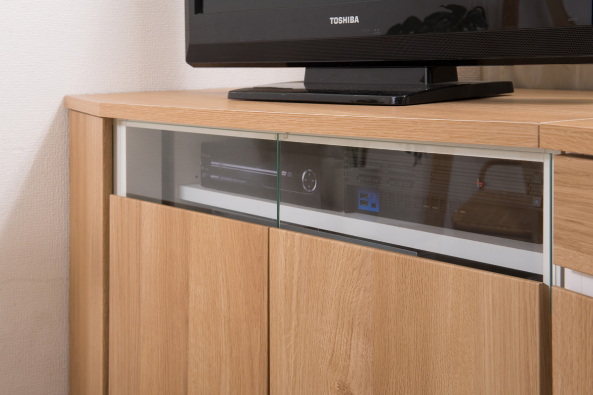 パソコンデスクやテレビボードとしてもお使いいただけます。扉のガラス部分にAV機器を設置すれば、扉を閉めたままリモコンの操作が可能です。