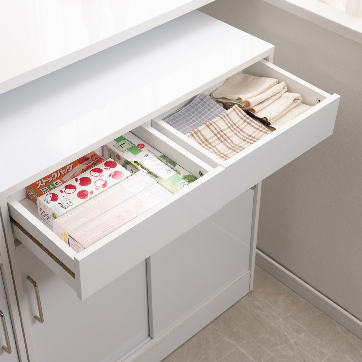 引き戸式の扉は、テーブルをピッタリつけても、テーブルを動かすことなく開閉できます。また、上部の引出しも、高さ73cm以下のテーブルであればそのまま引き出せます。カトラリーやランチョンマット、取り皿などを入れておけば食卓の準備は座ったままできます。