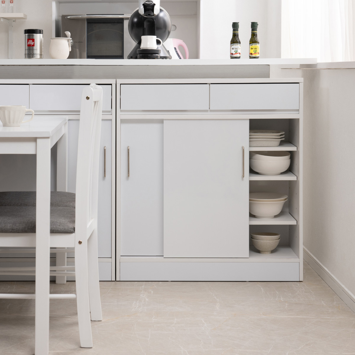 造りつけのような、スクエアでシンプルなフォルムのカウンター下キャビネット 幅80cm(画像:右)です。引き戸式の扉でお部屋をスッキリとした印象にしてくれます。