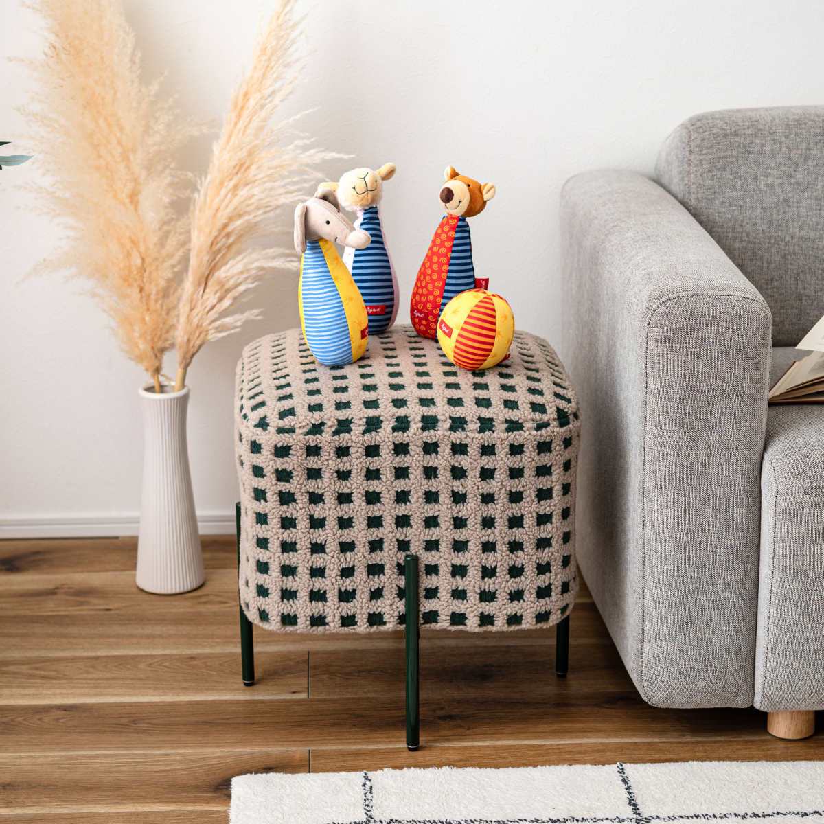凹凸のあるボア素材を使用した可愛らしいフォルムのスツールです。触り心地が良い立体的な質感のチェック模様が特徴的です。取り入れるだけで空間を華やかに彩ってくれます。