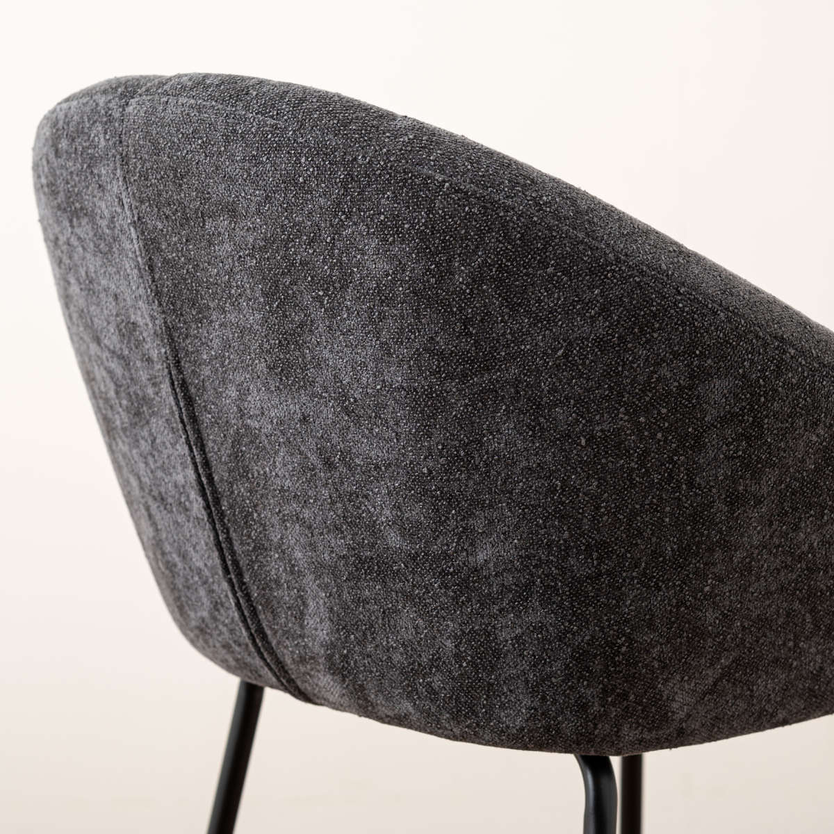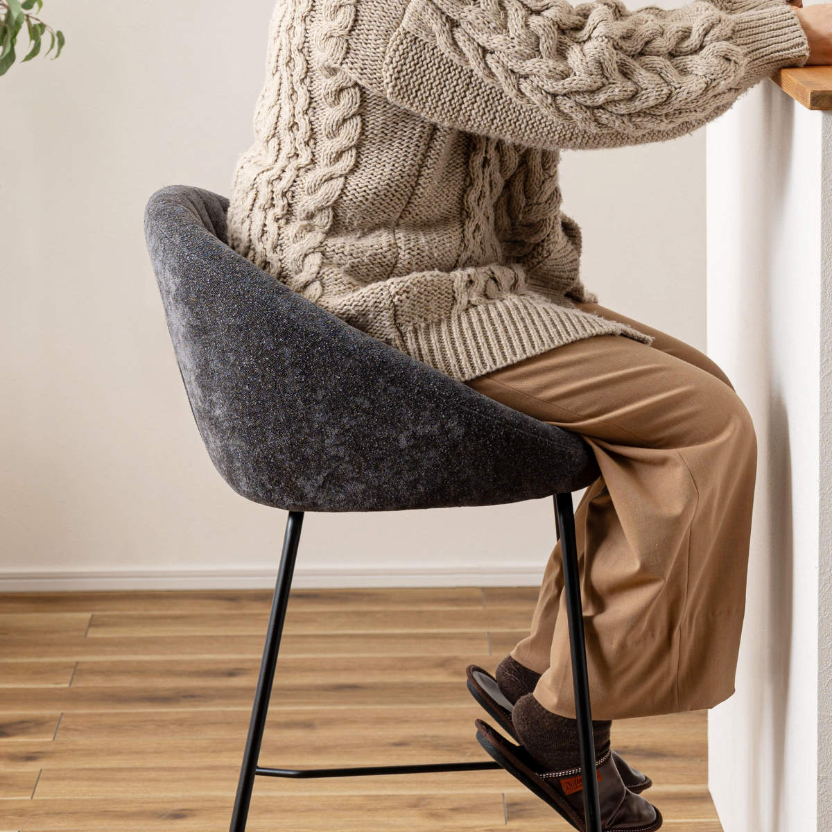 丸いフォルムが身体を包み込んで、快適な座り心地を提供してくれます。細身のスチール脚はスッキリとした印象を与えてくれます。高さのあるハイチェアですがお部屋に圧迫感を与えません。