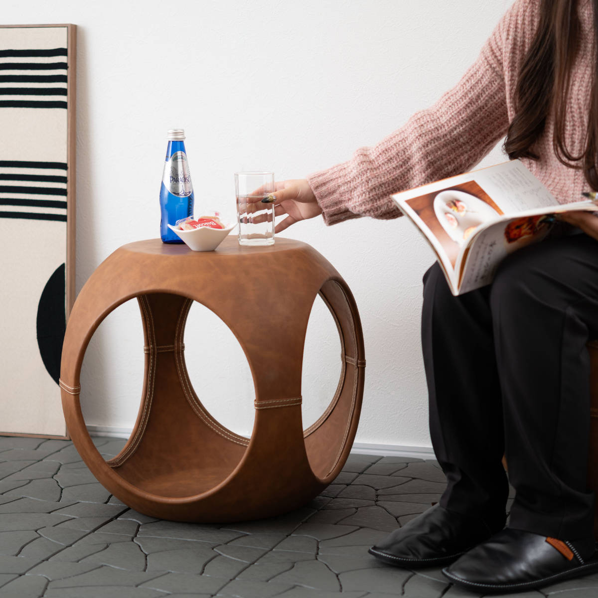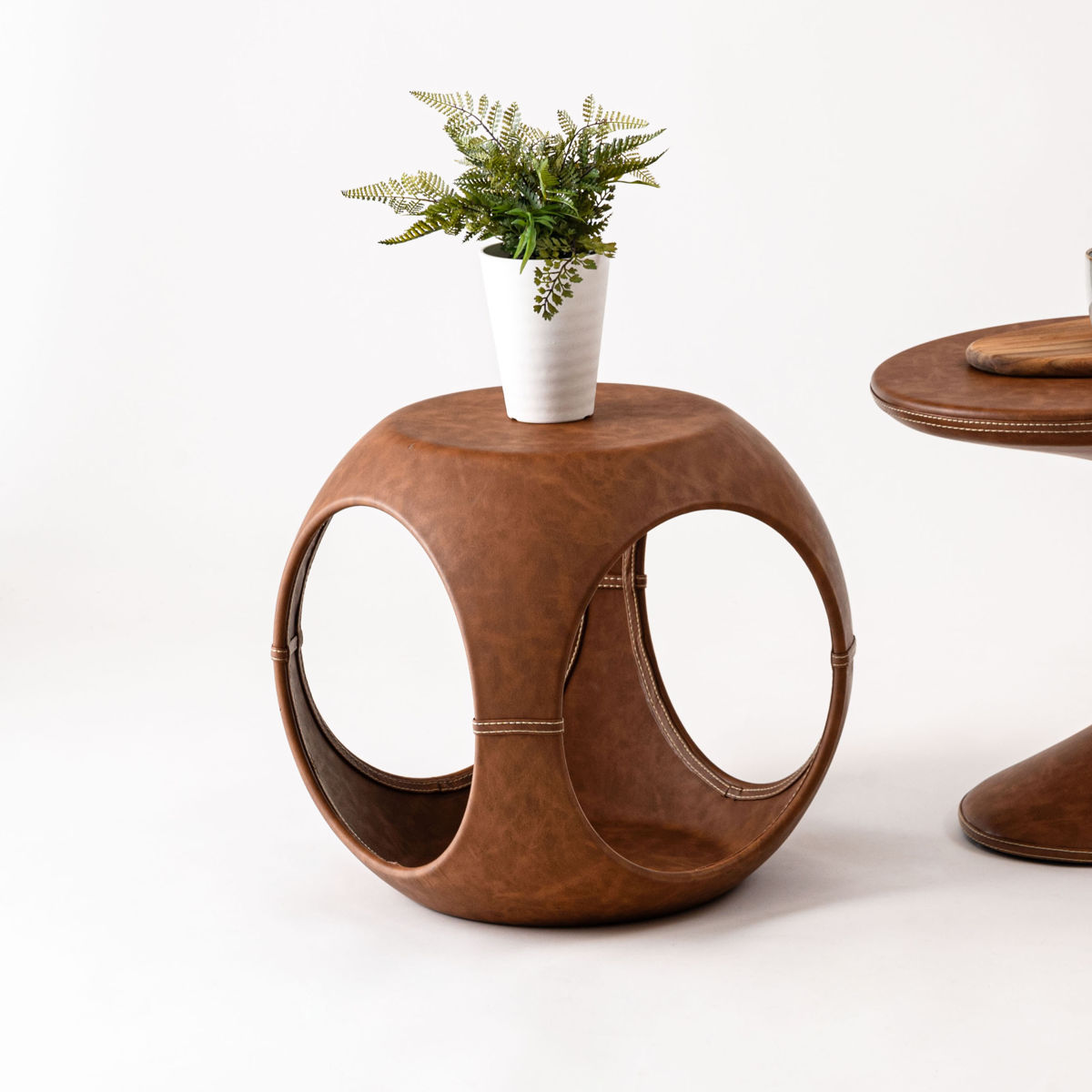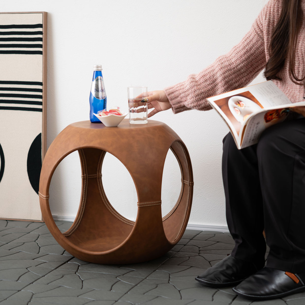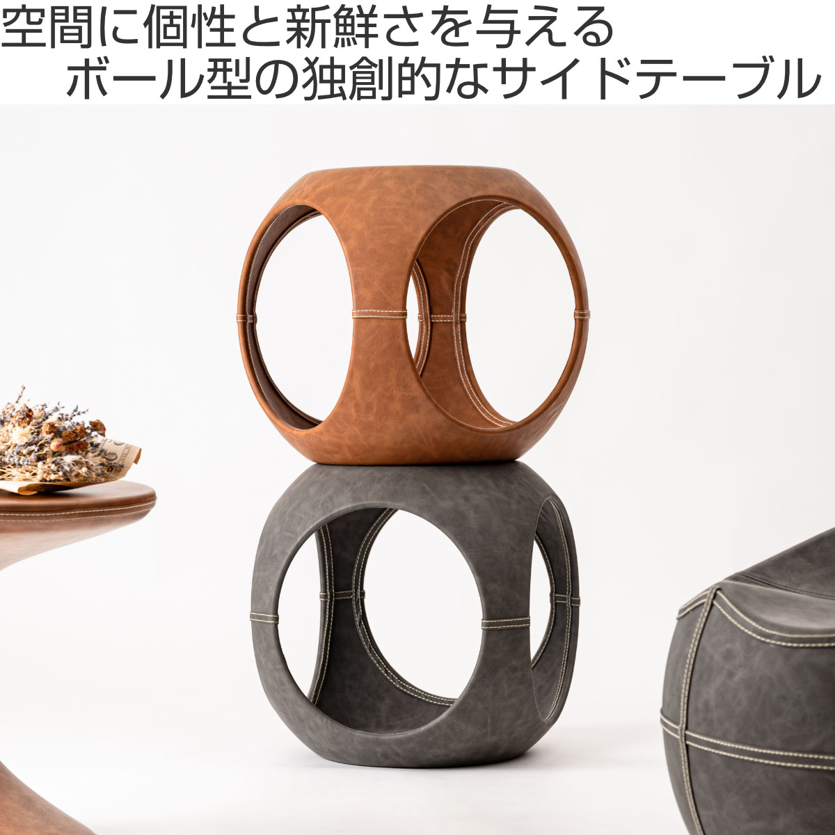 高級感のあるソフトレザーの質感と流線型のフォルムが絶妙な調和を魅せてくれるサイドテーブルです。サイドと内側のステッチもアクセント。独創的なフォルムが空間を彩ってくれるので、置くだけで主役になります。個性的ながら、平らな底と天板でしっかりとした安定感も兼ね備えています。