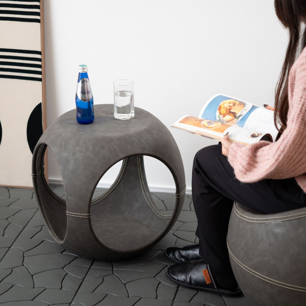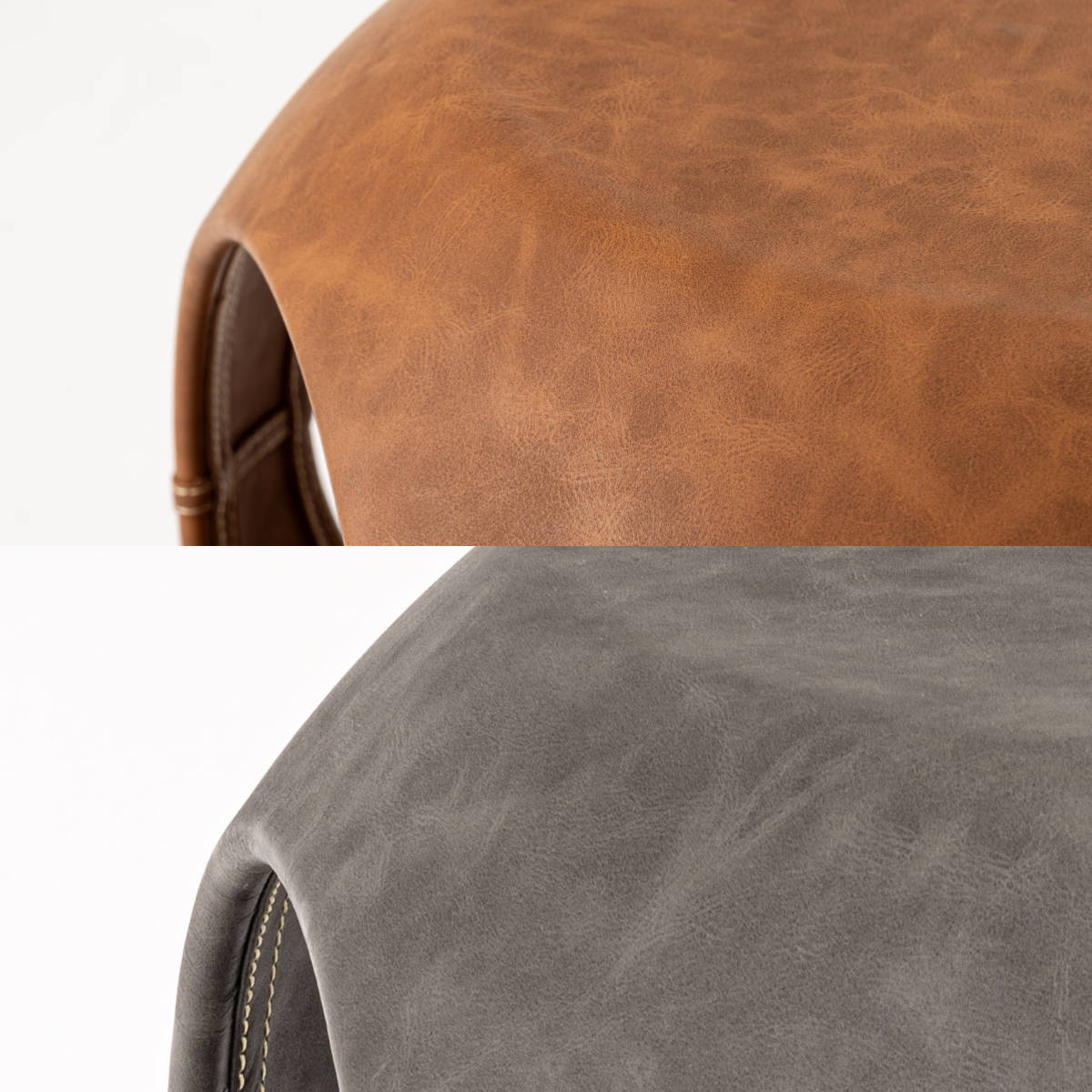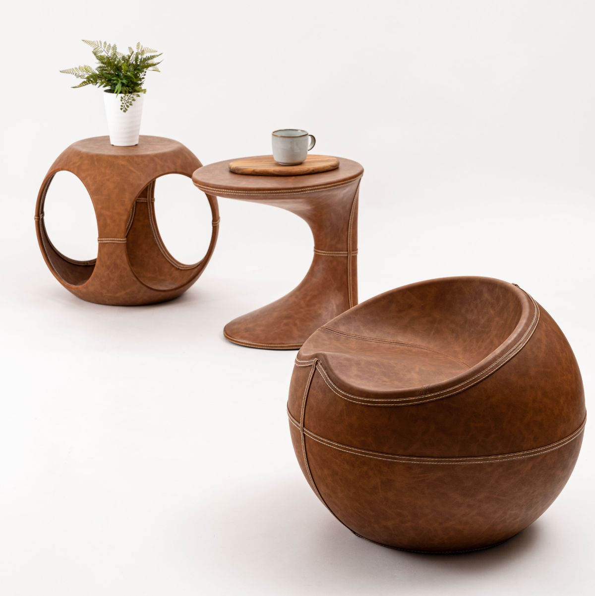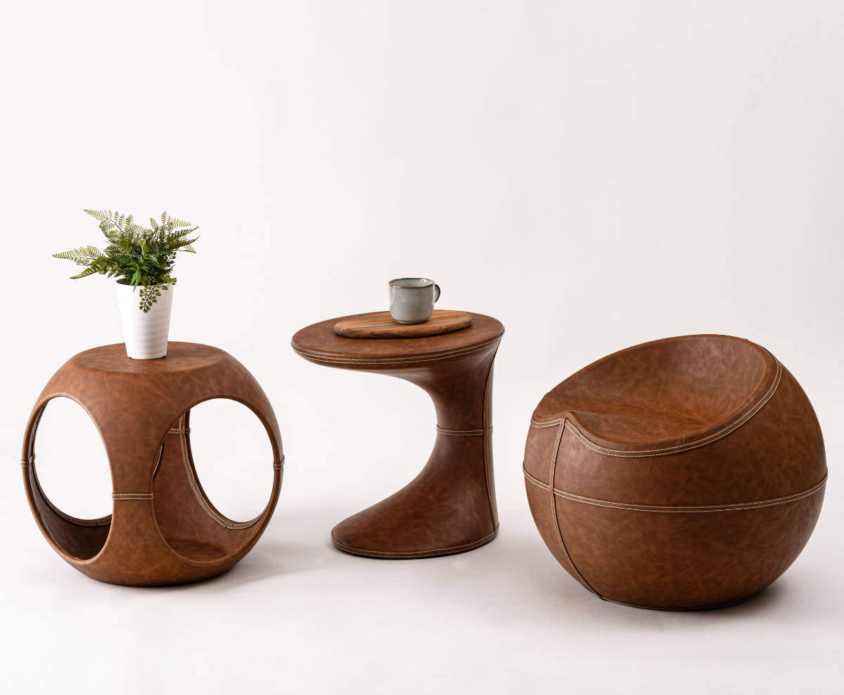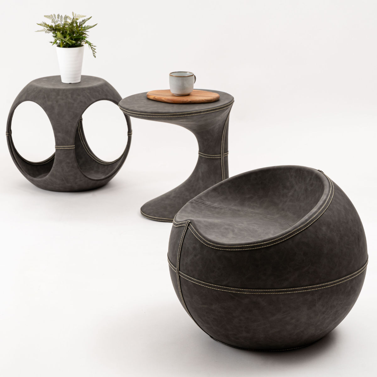 高級感のあるソフトレザーの質感と流線型のフォルムが絶妙な調和を魅せてくれるサイドテーブルです。サイドと内側のステッチもアクセント。独創的なフォルムが空間を彩ってくれるので、置くだけで主役になります。個性的ながら、平らな底と天板でしっかりとした安定感も兼ね備えています。