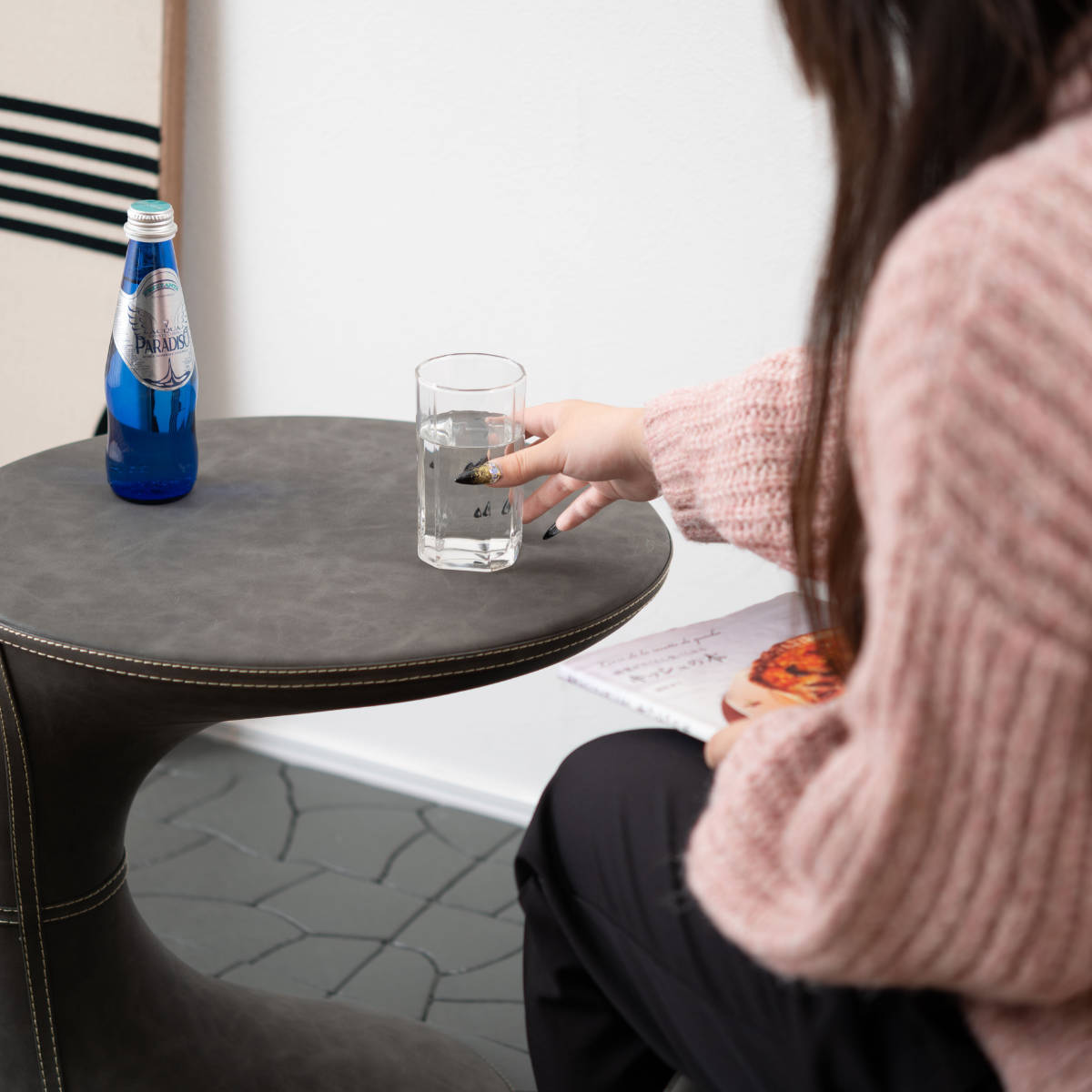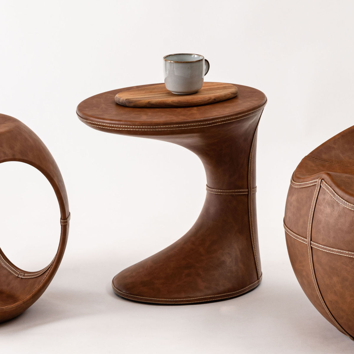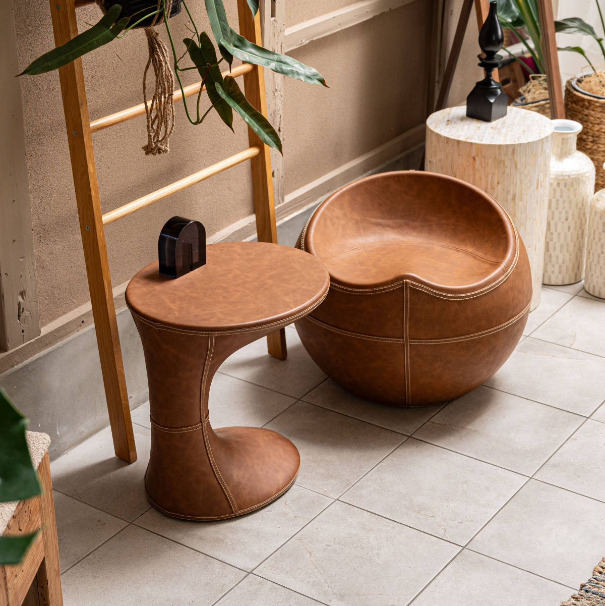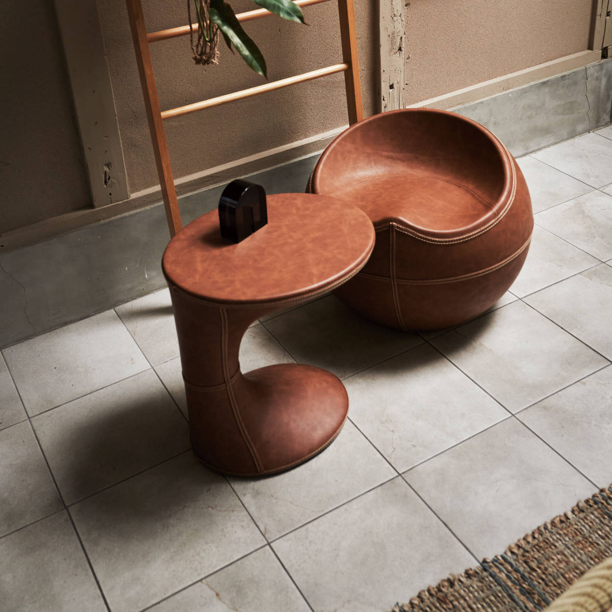 高級感のあるソフトレザーの質感と流線型のフォルムが絶妙な調和を魅せてくれるサイドテーブルです。サイドと内側のステッチもアクセント。独創的なフォルムが空間を彩ってくれるので、置くだけで主役になります。個性的ながら、平らな底と天板でしっかりとした安定感も兼ね備えています。