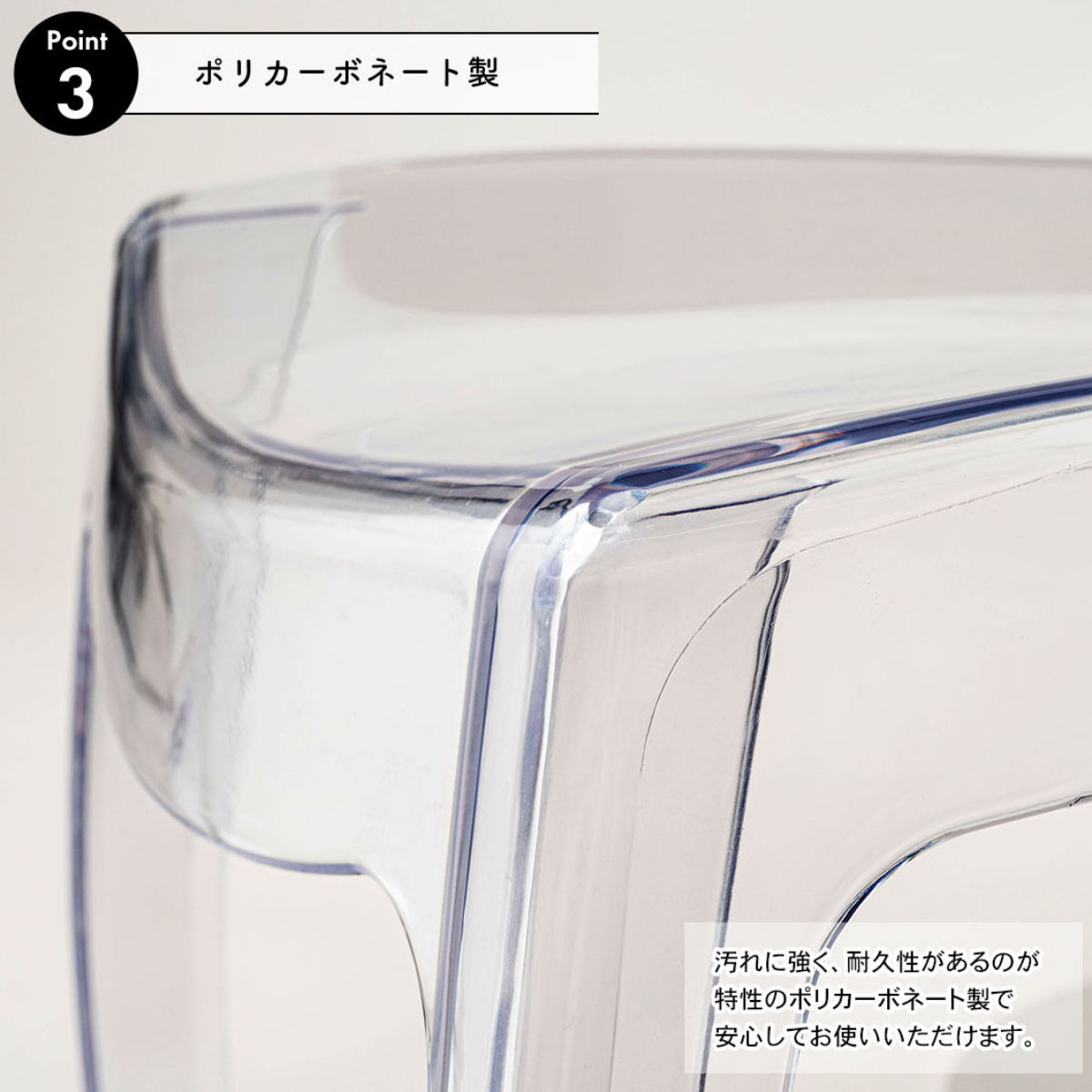 耐久性と透明感のある性質のポリカーボネートを使用。軽量なので移動もラクラクです。汚れに強く、割れにくく耐衝撃性が高いので、毎日の暮らしの中でも安心です。