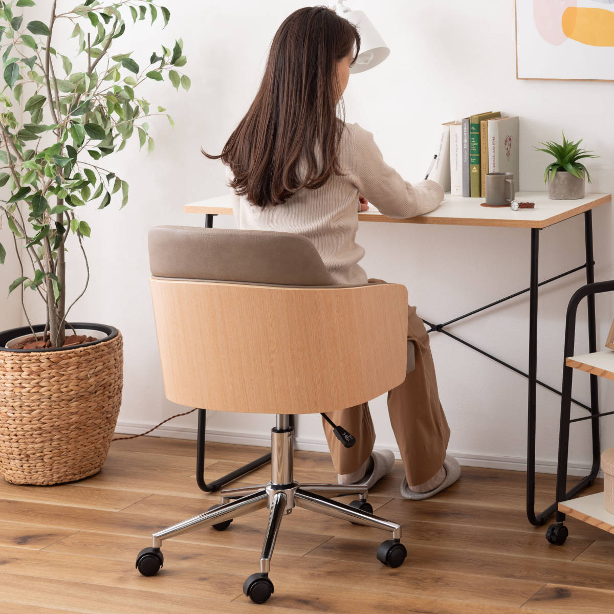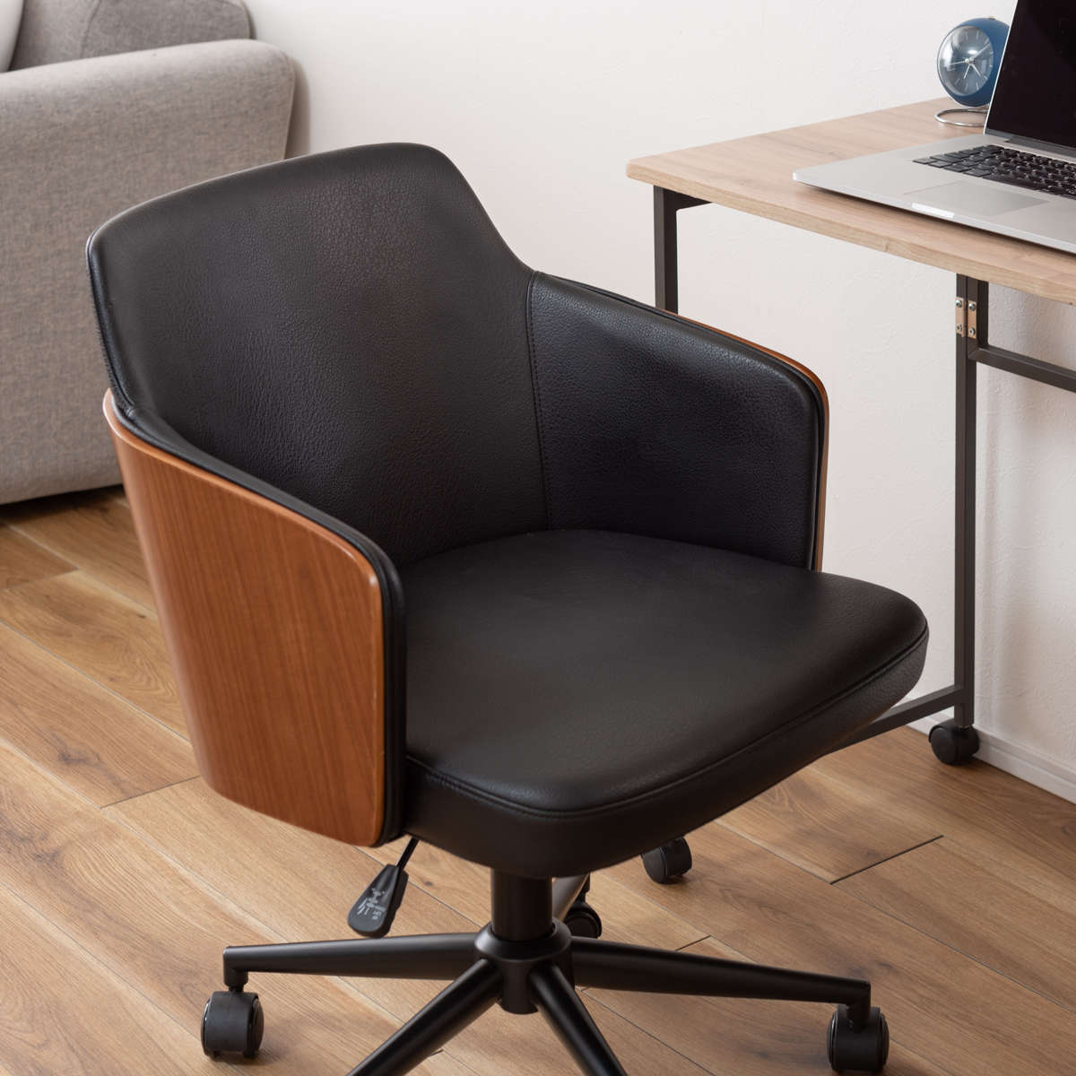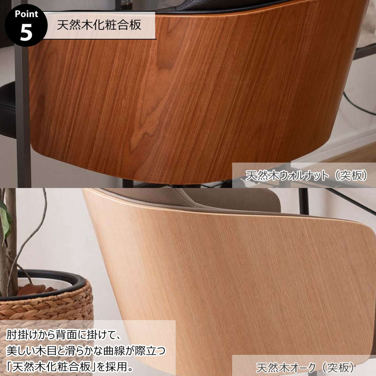 ひじ掛けから背面にかけて美しい木目と滑らかな曲線が際立つ「天然木化粧合板」を採用。ソフトレザーと木目調の組み合わせの品のあるスッキリとしたデザインが、シンプルでモダンな空間を演出します。