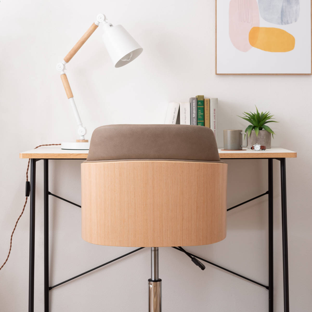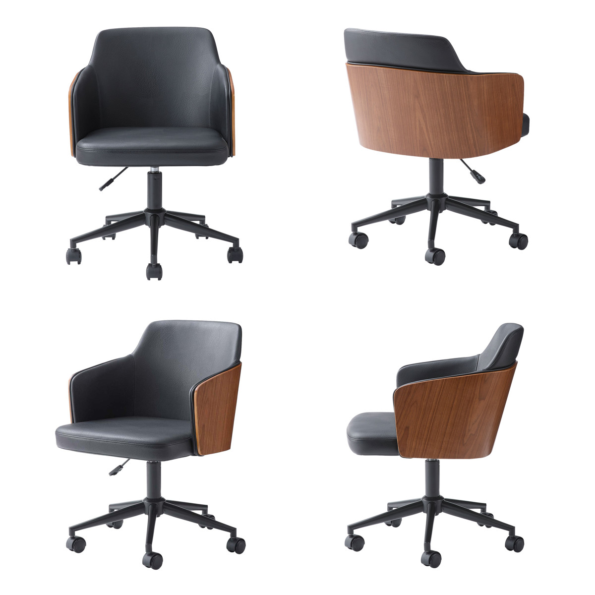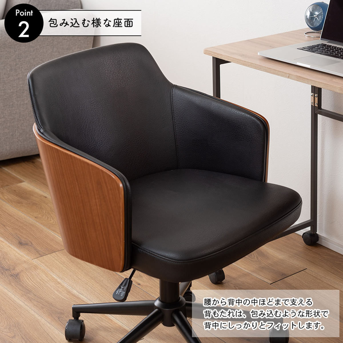 ひじ掛けから背面にかけて美しい木目と滑らかな曲線が際立つ「天然木化粧合板」を採用。ソフトレザーと木目調の組み合わせの品のあるスッキリとしたデザインが、シンプルでモダンな空間を演出します。