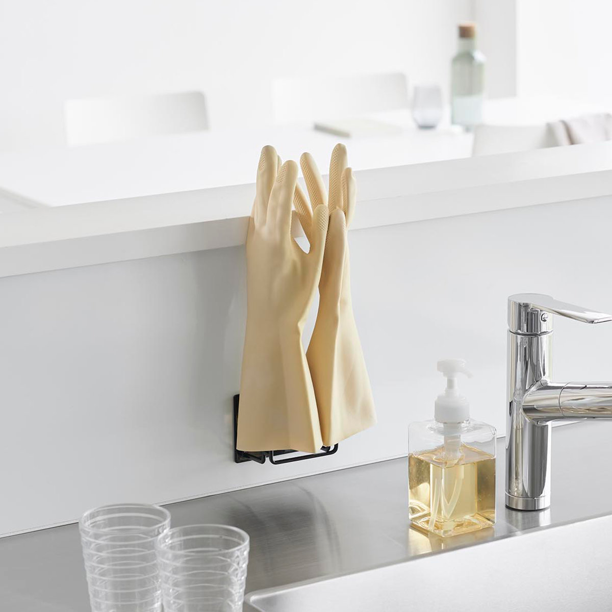 シンク中やキッチンパネルを有効活用して置き場所に困るゴム手袋を収納できるグローブホルダーです。マグネットの付く場所に簡単に取り付けて使用できます。