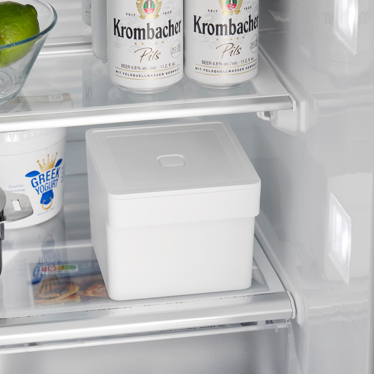 シンプルな角型のフォルムだから揃えて使用しても冷蔵庫内がスッキリまとまります。ハンドル付きで取り出しやすく使いやすいデザインです。