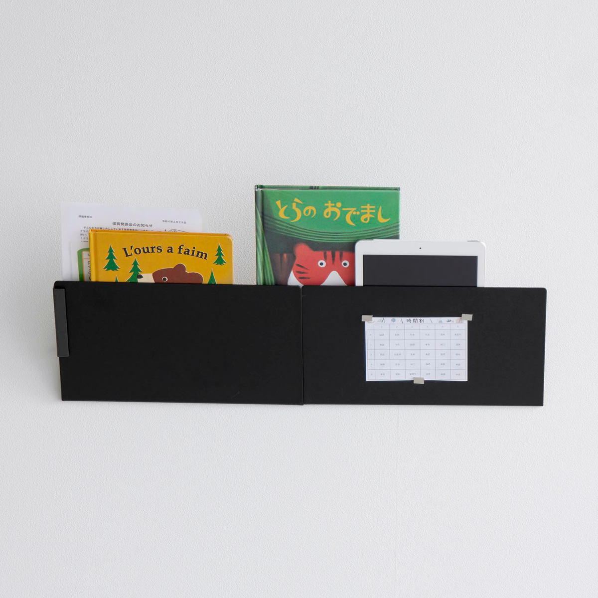 雑誌や絵本、プリント類の書類やタブレット端末などすぐ手に取れる場所に置くことができるので便利です。