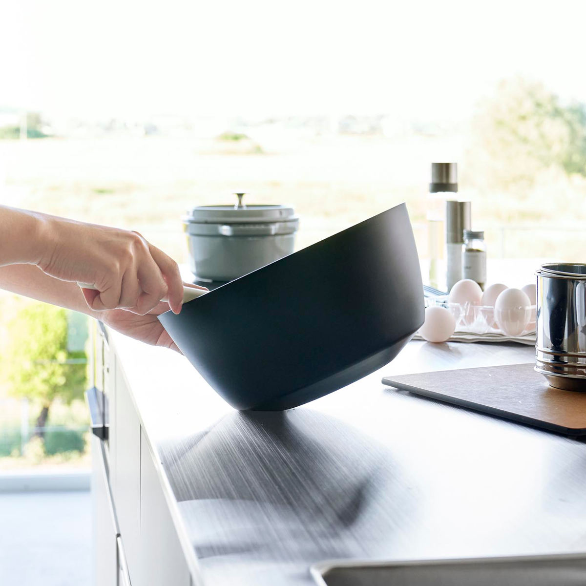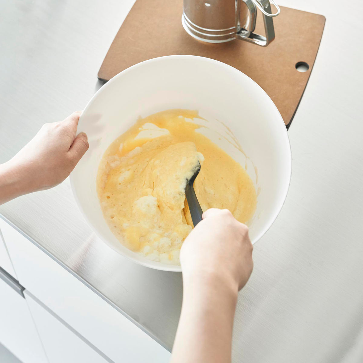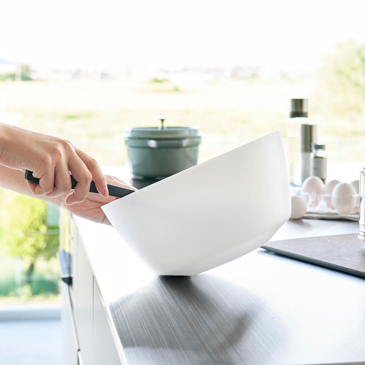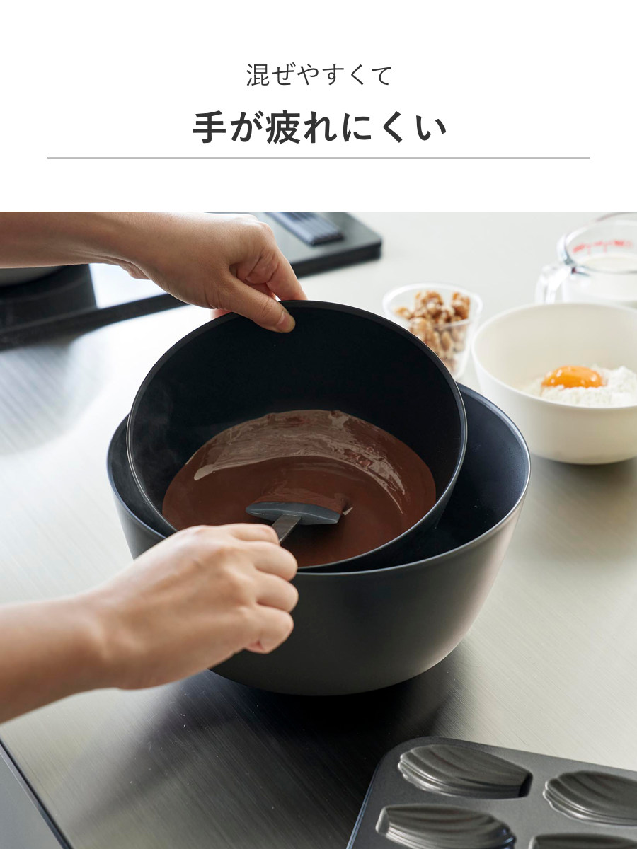 ボウルを倒した時に斜めをキープできる構造で、食材が混ぜやすく手が疲れにくい調理ボウルです。料理の下ごしらえからお菓子作りなど毎日使う調理ボウルだからこそ使いやすさを追求しました。