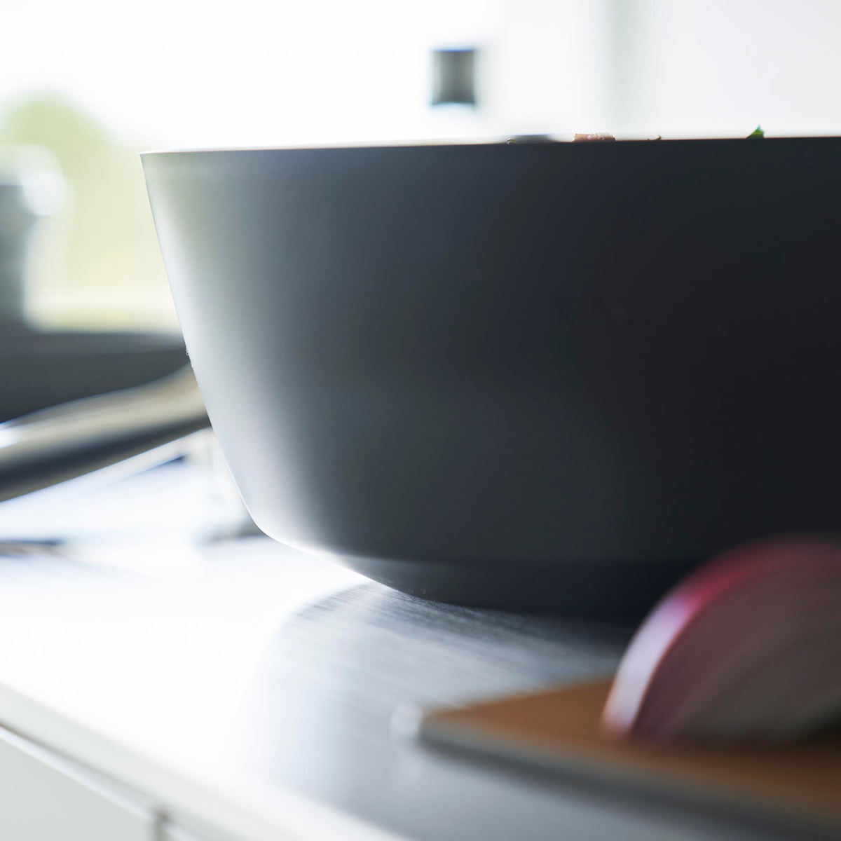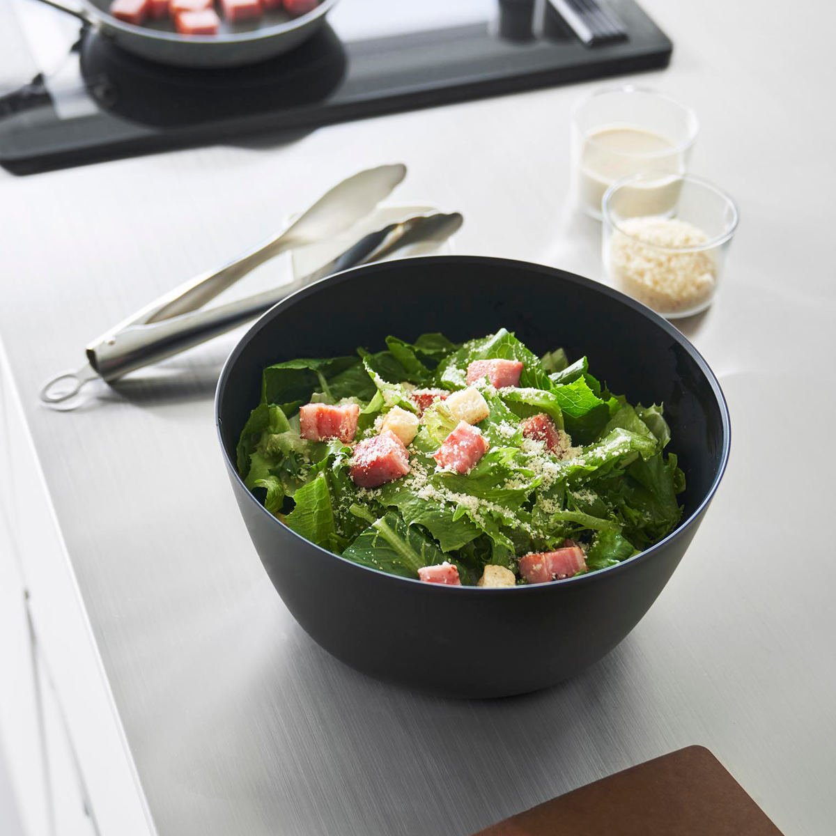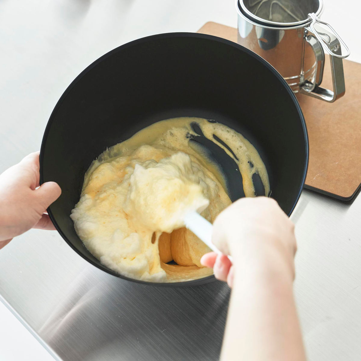 ボウルを倒した時に斜めをキープできる構造で、食材が混ぜやすく手が疲れにくい調理ボウルです。料理の下ごしらえからお菓子作りなど毎日使う調理ボウルだからこそ使いやすさを追求しました。