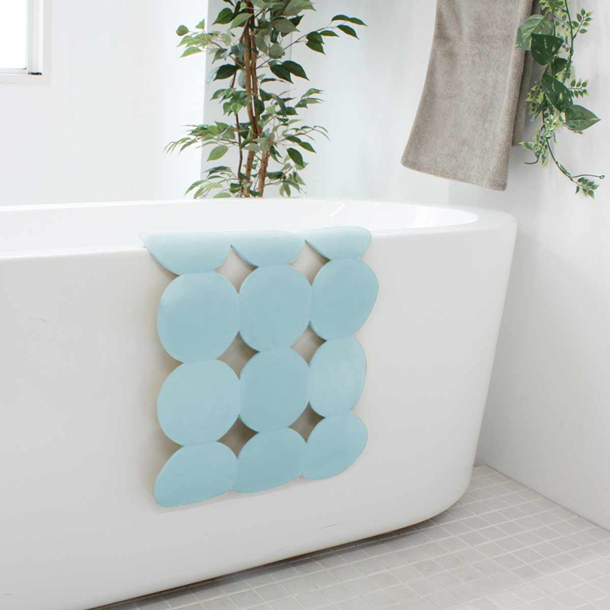 使用後は水で洗い流し、浴槽の縁にかけておくだけでお手入れ簡単です。使用しない時は丸めてコンパクトに収納できます。
