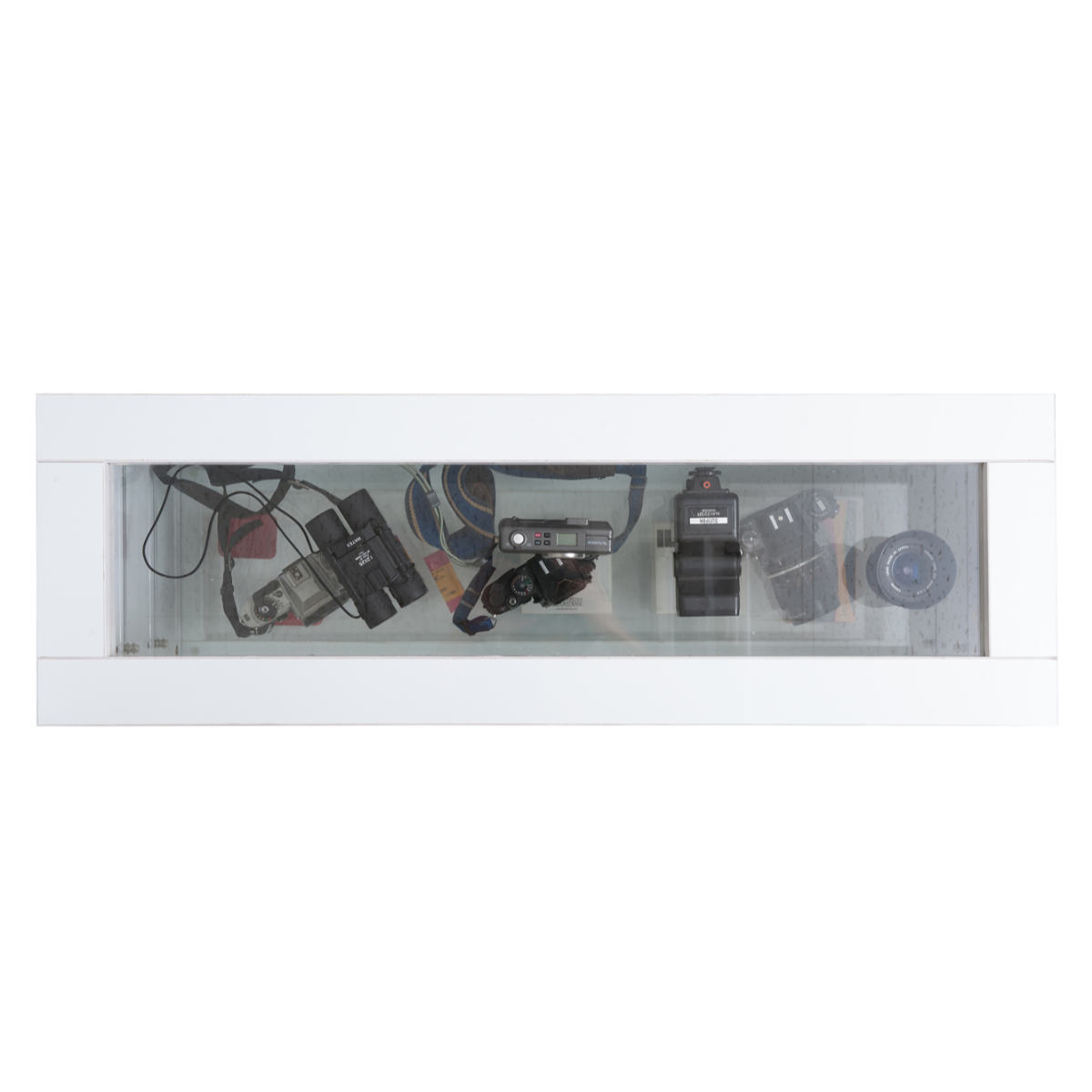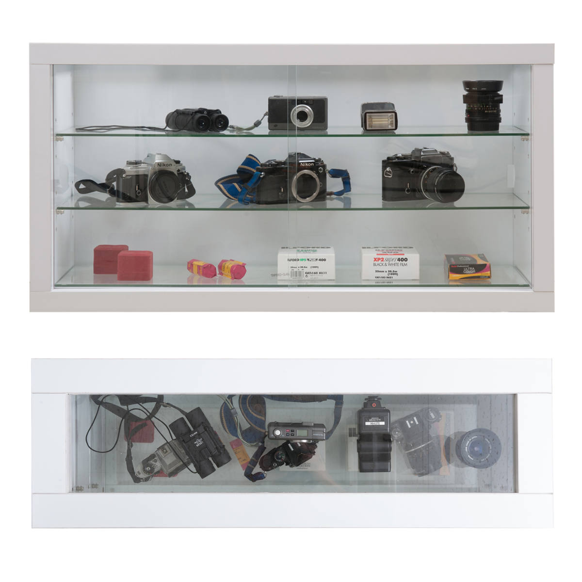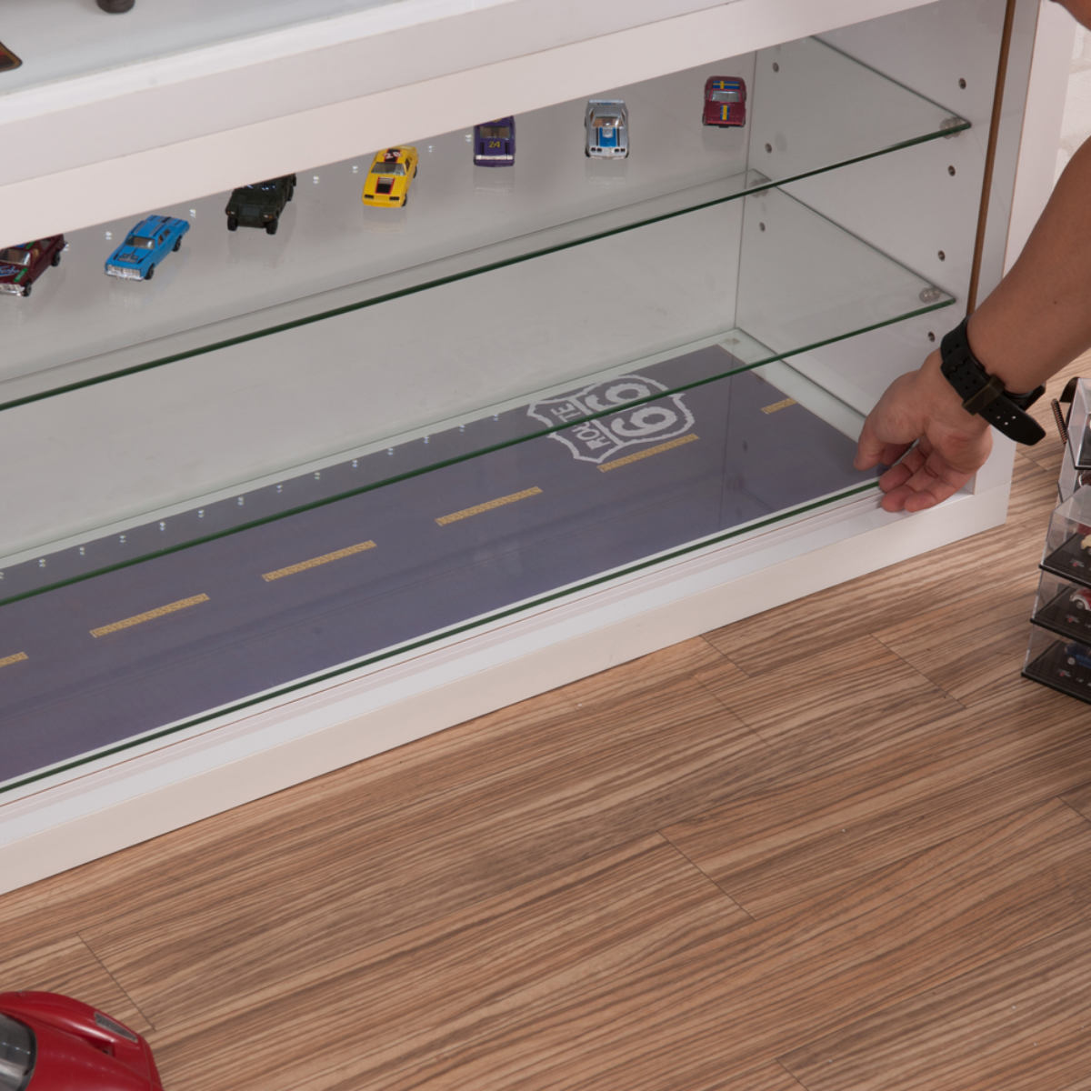 背板と強化ガラスの間にオリジナルの壁紙を挟んで展示することができます。底面のガラス部分も同様に印刷物を貼付け可能なので、より一層コレクションに躍動感のある動きを与えることができます。