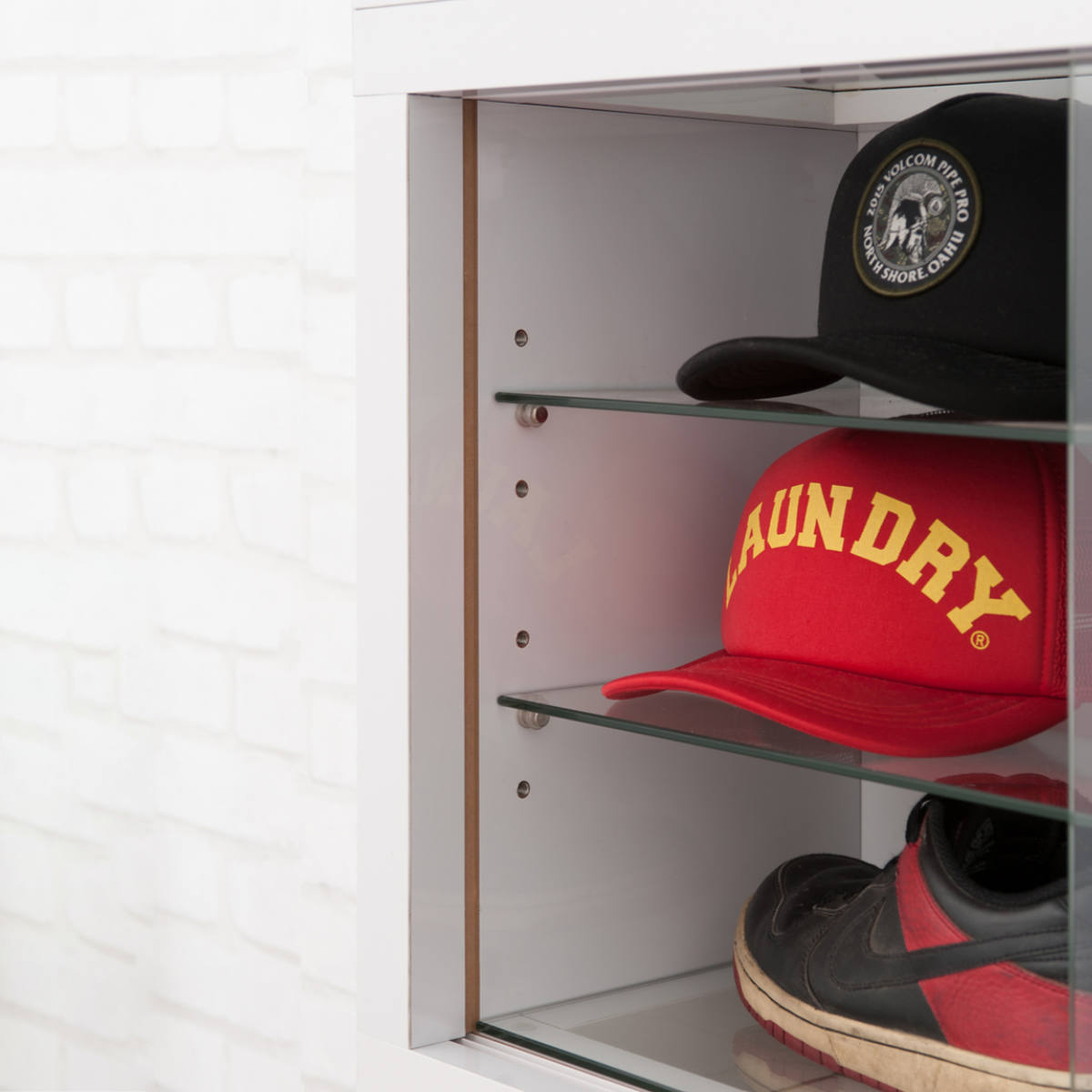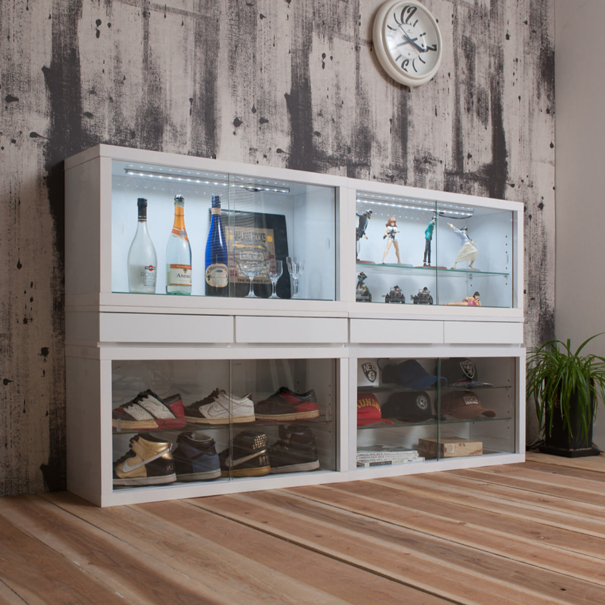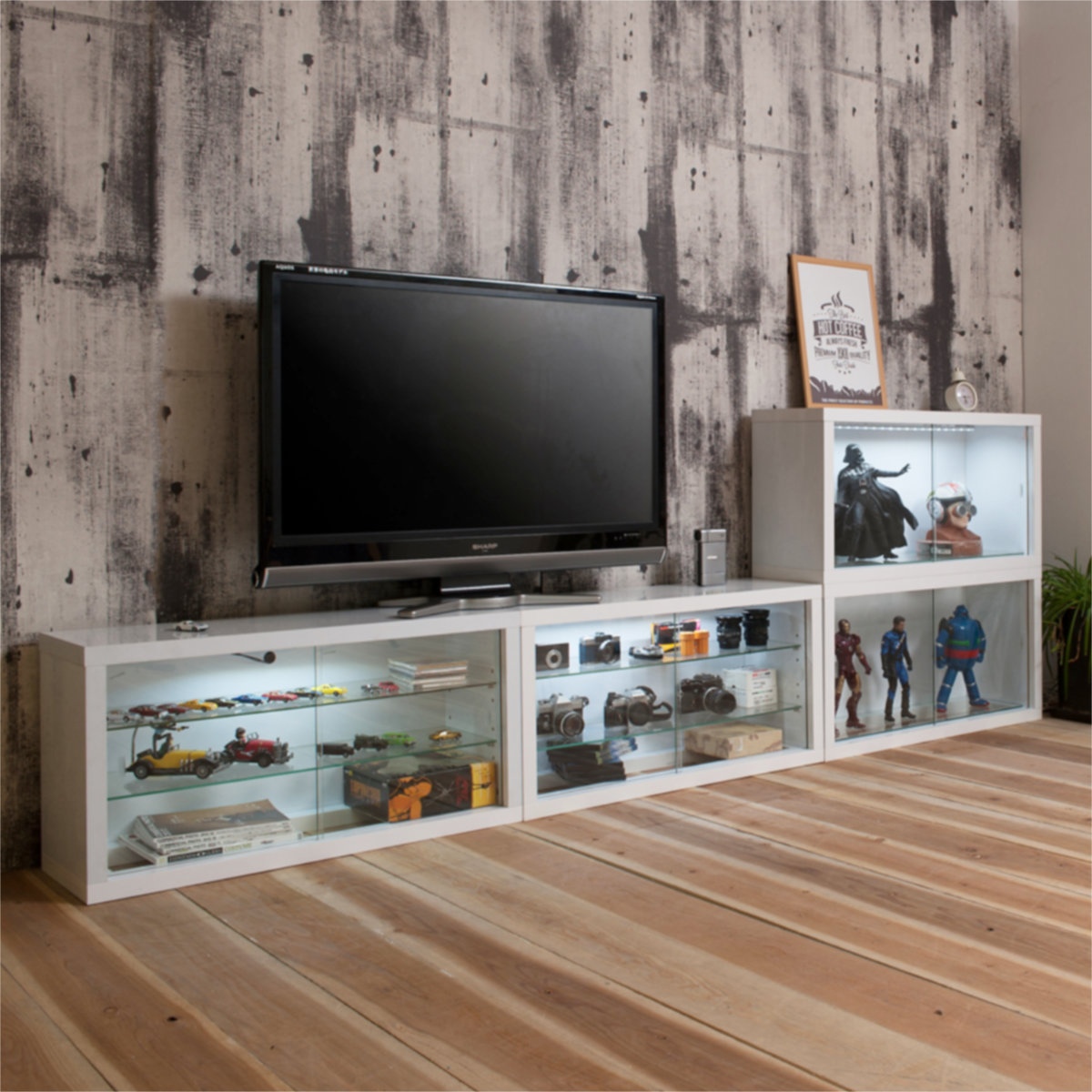 高級感漂うハイグロス仕上げです。天板にディスプレイすると鏡のように映し出されるのでコレクションが更に引き立ちます。また、汚れた時もサッと拭き取れるのでお手入れも簡単です。