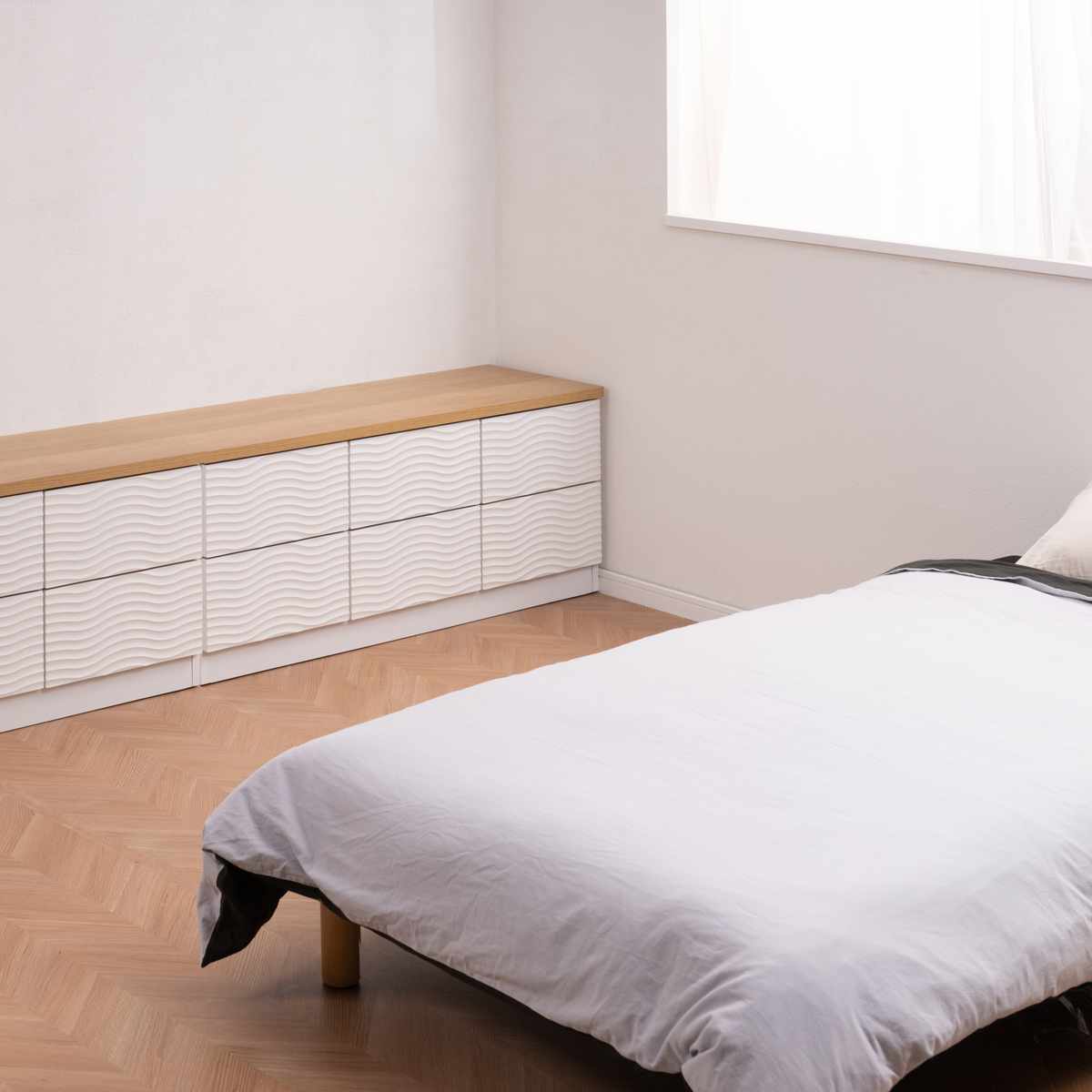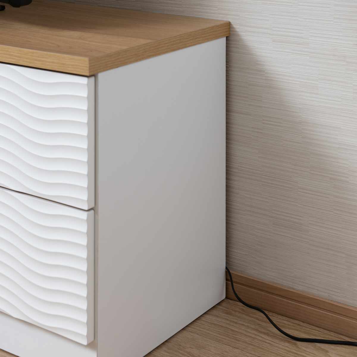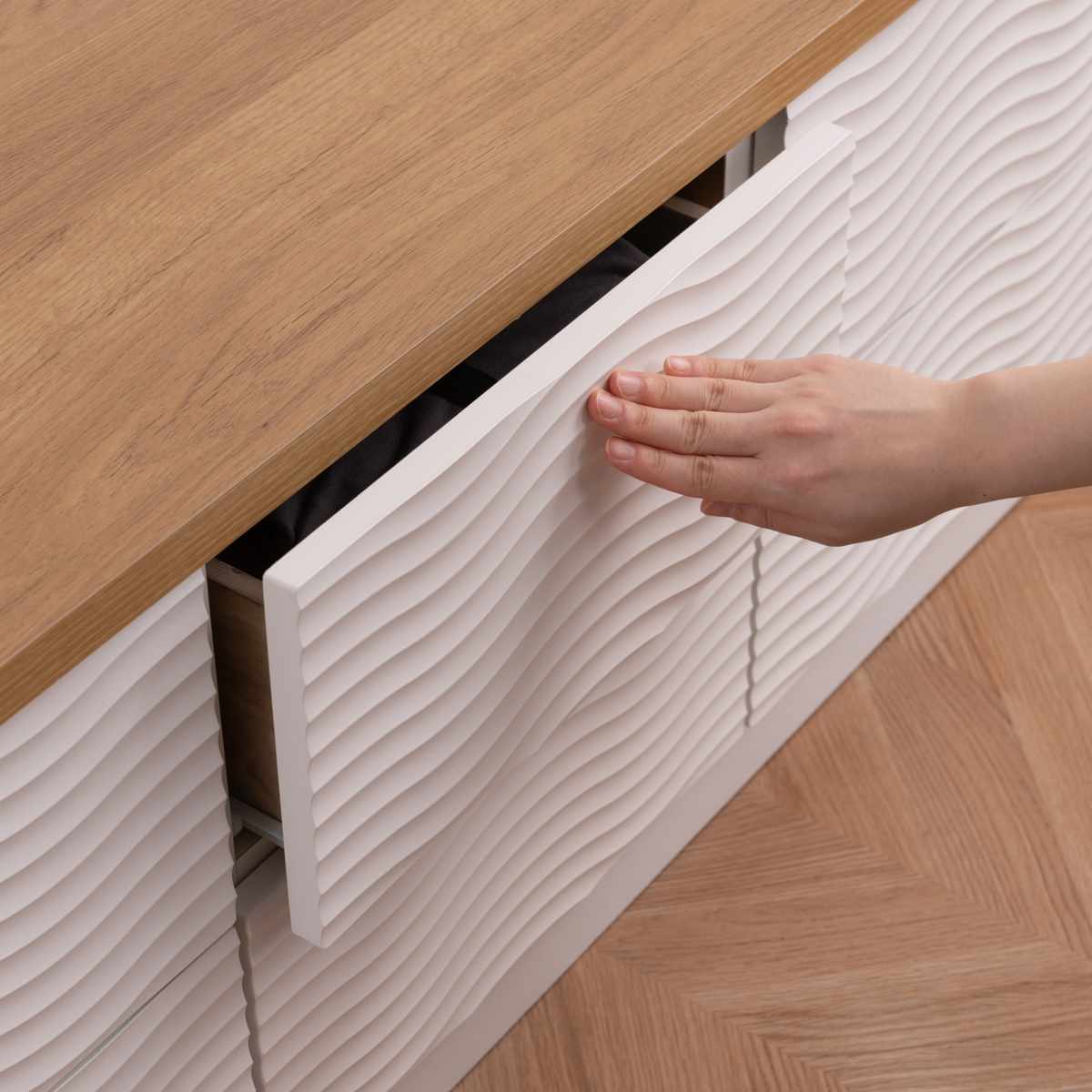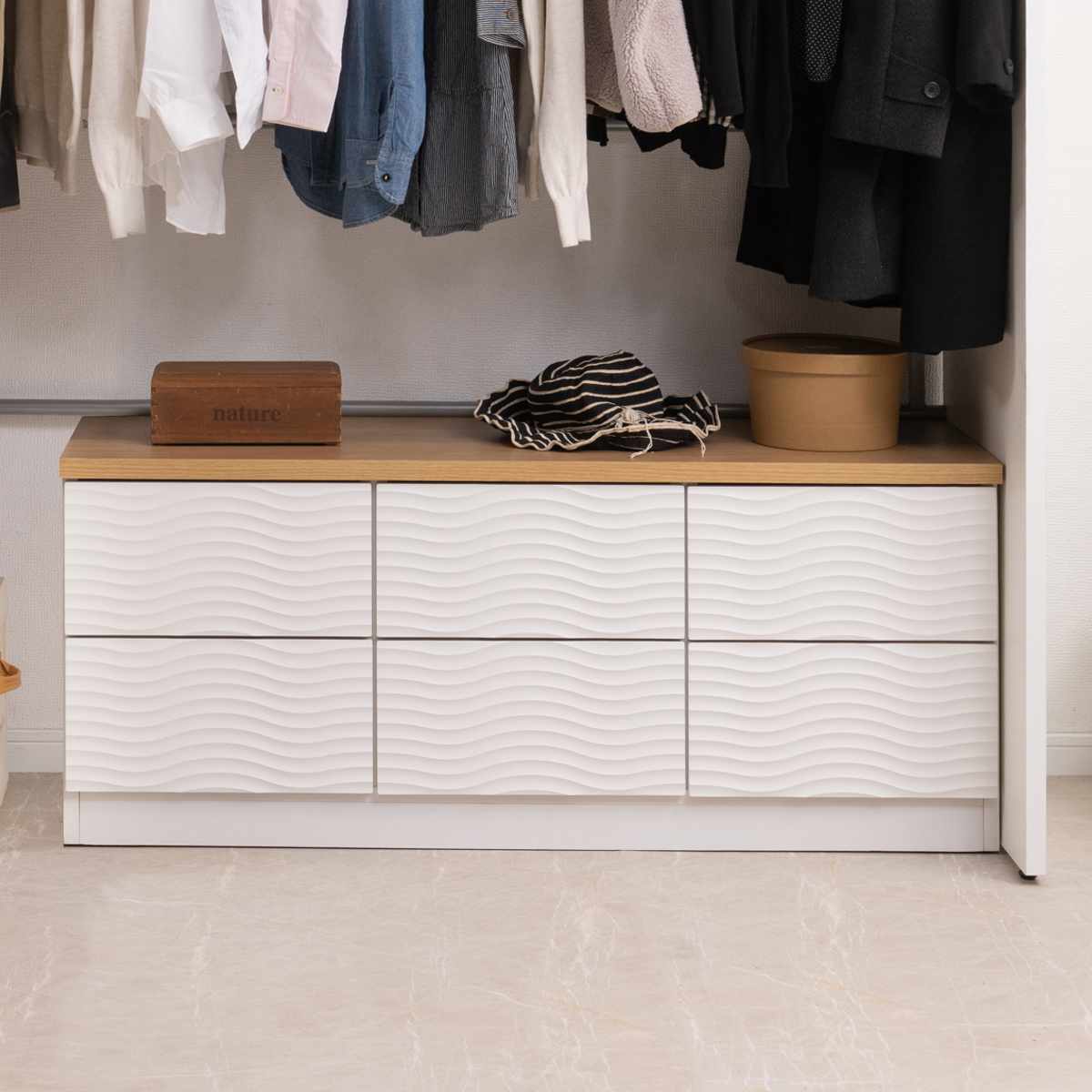 本体のウェーブ柄のホワイトと、天板のナチュラルカラーがマッチしたチェストです。飽きのこないシンプルなデザインで、リビングや寝室、子ども部屋など様々な場所でお使いいただけます。