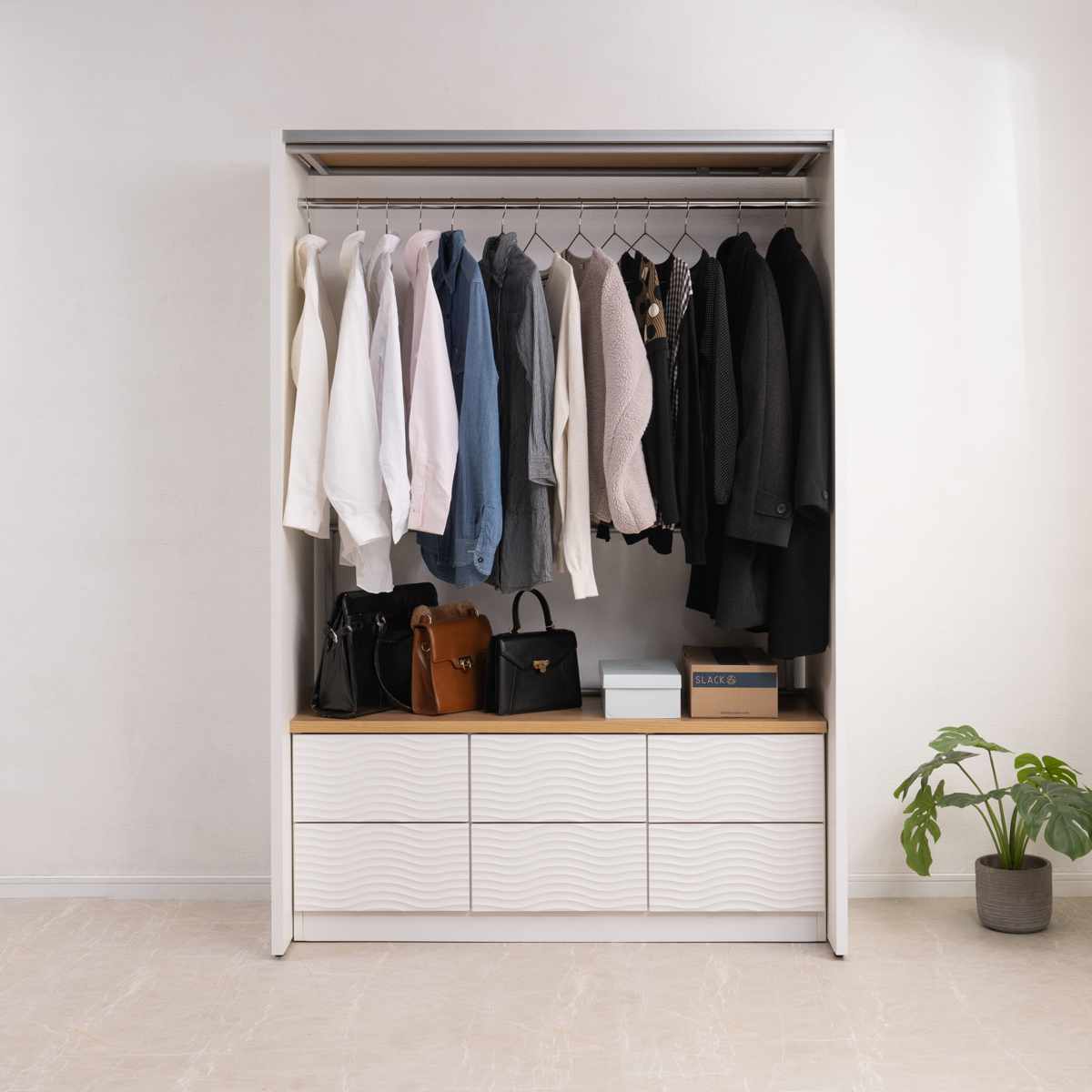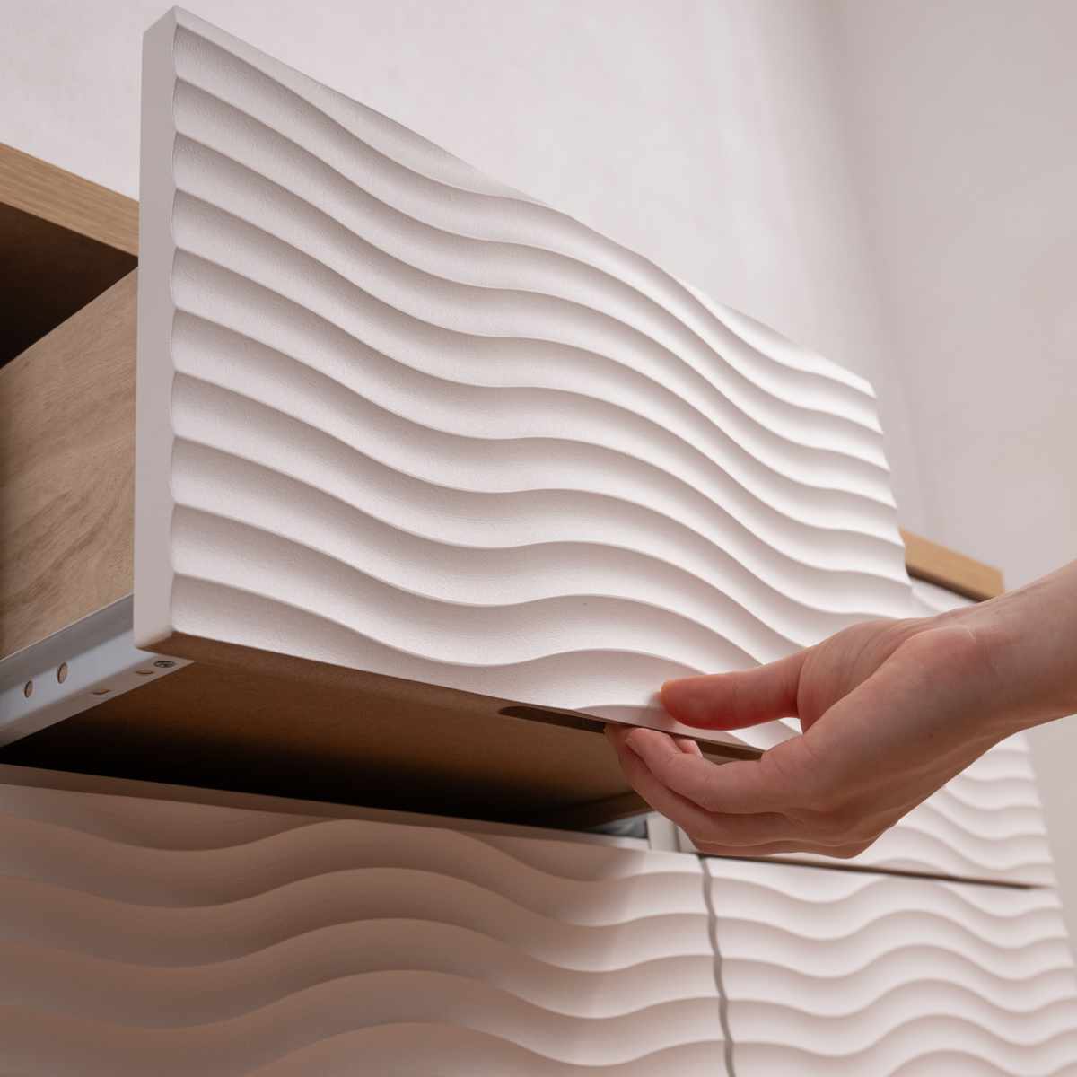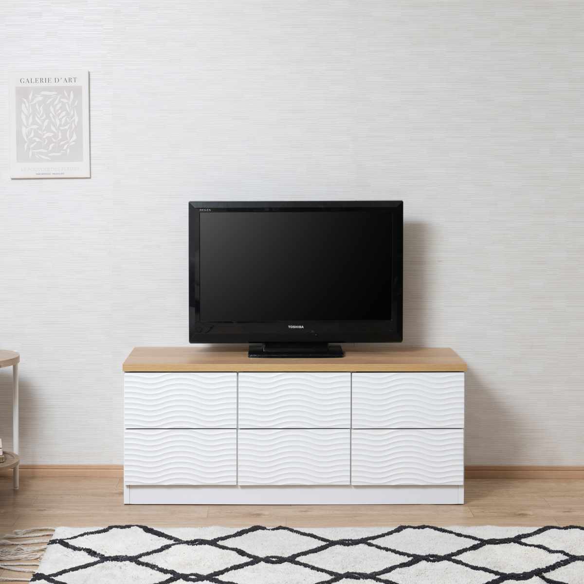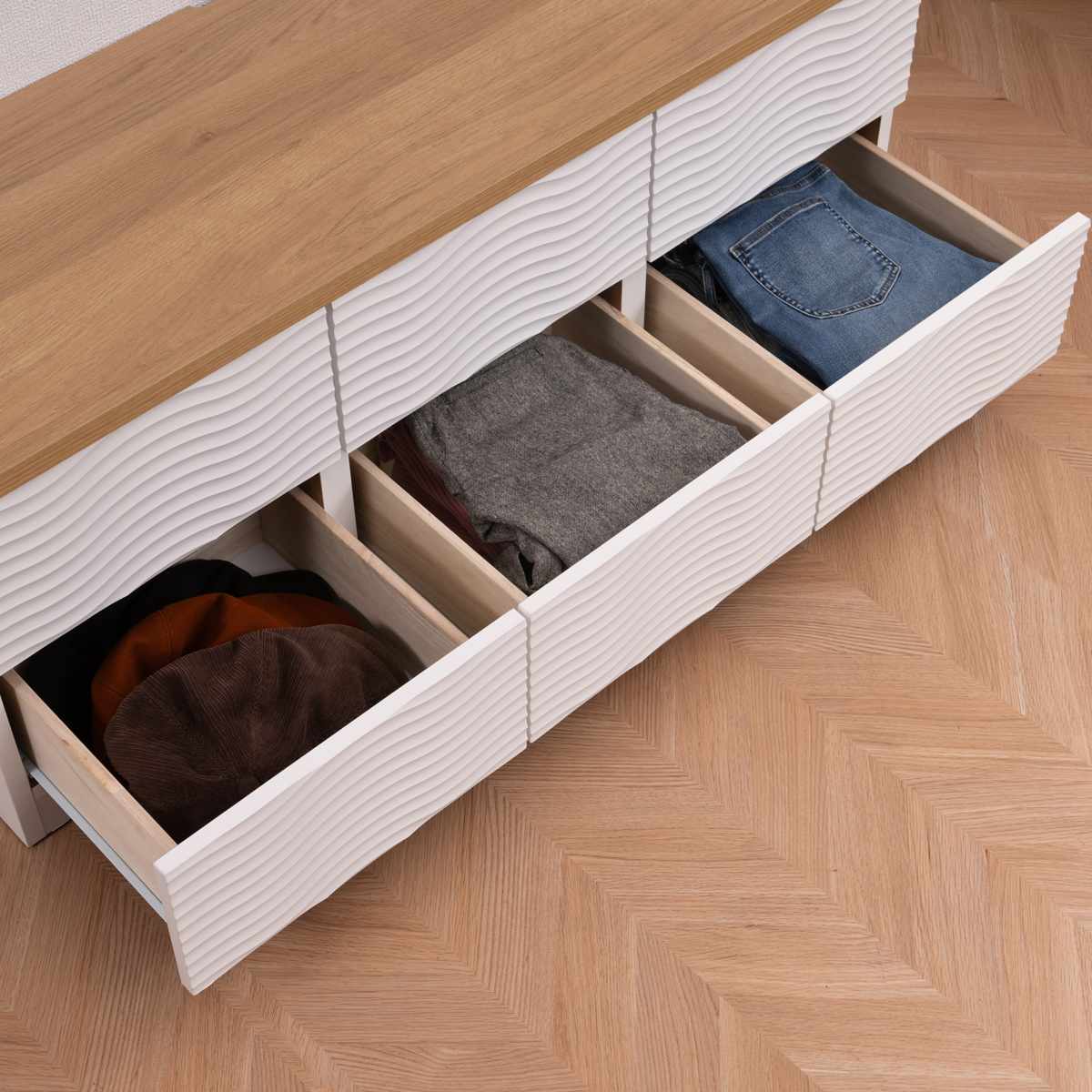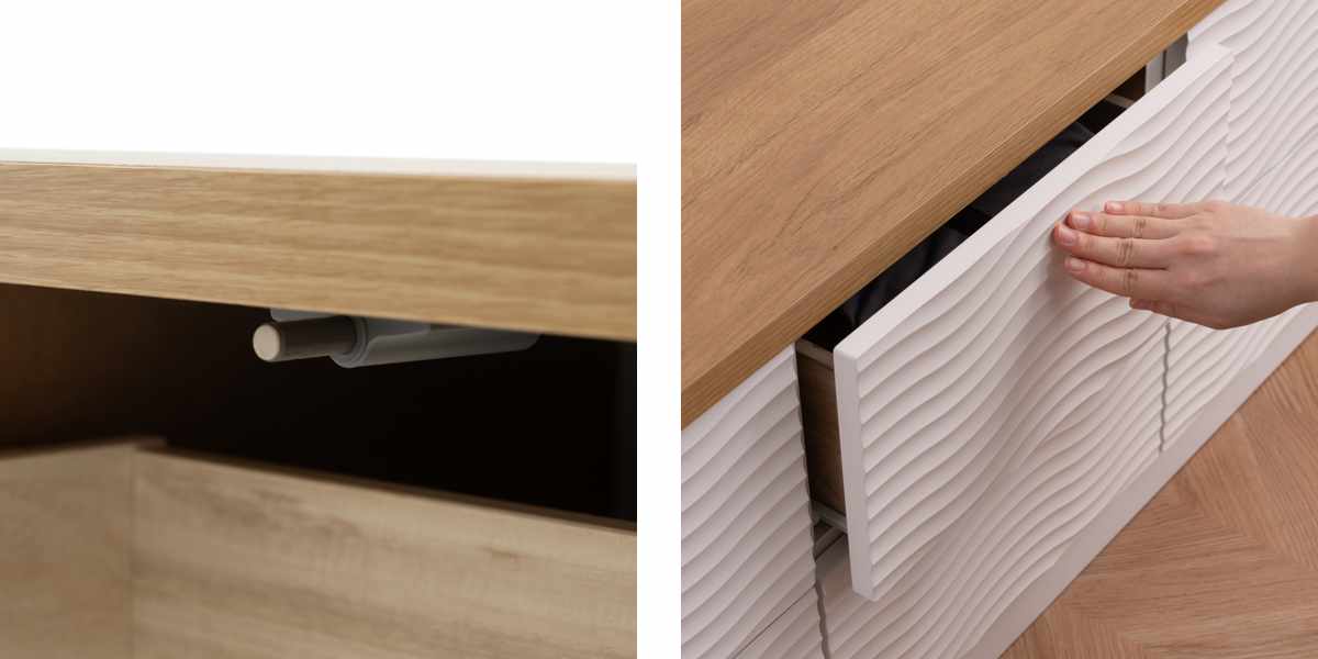 本体のウェーブ柄のホワイトと、天板のナチュラルカラーがマッチしたチェストです。飽きのこないシンプルなデザインで、リビングや寝室、子ども部屋など様々な場所でお使いいただけます。