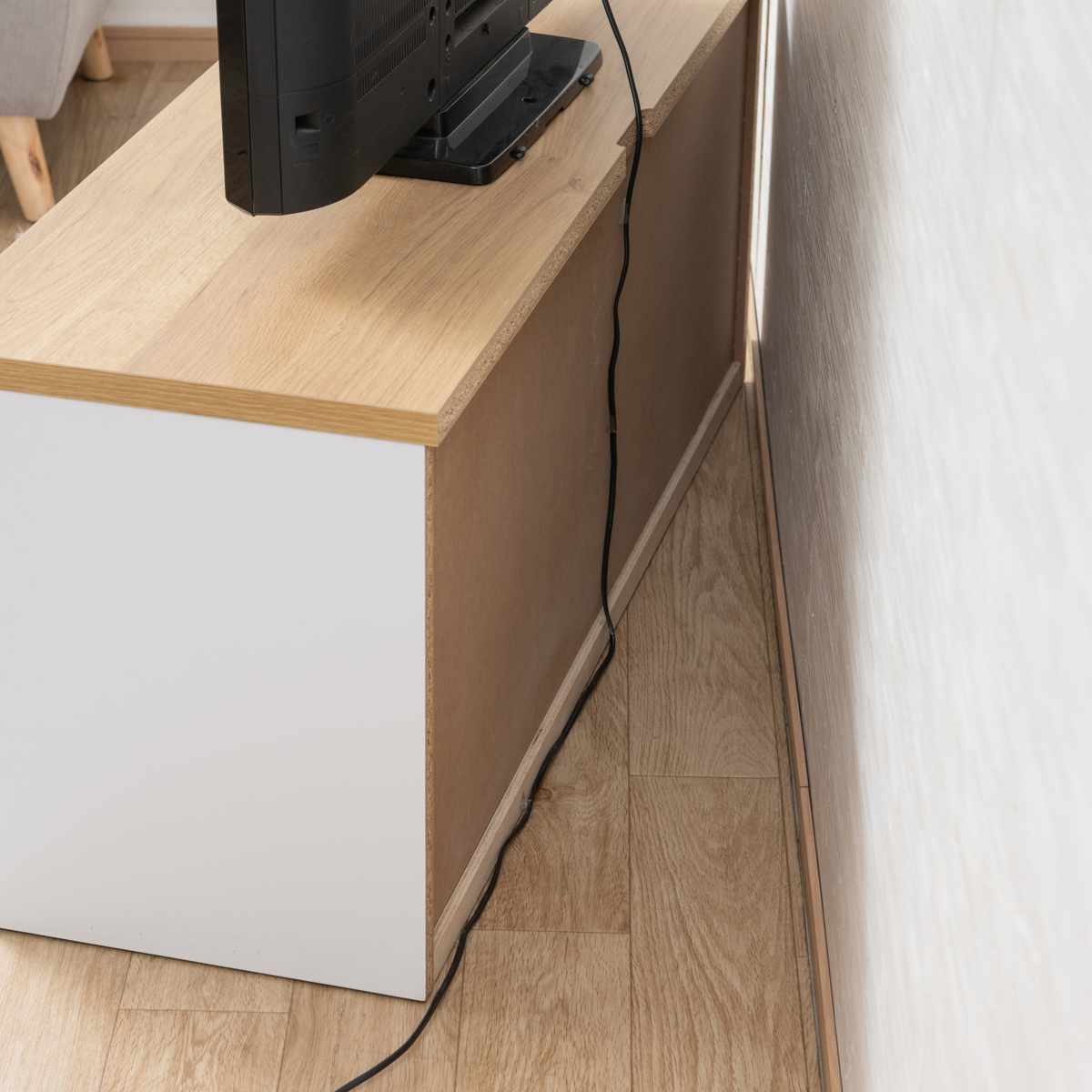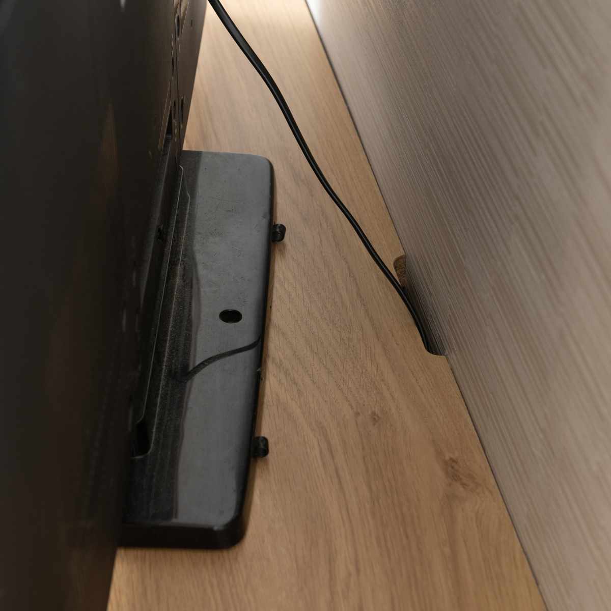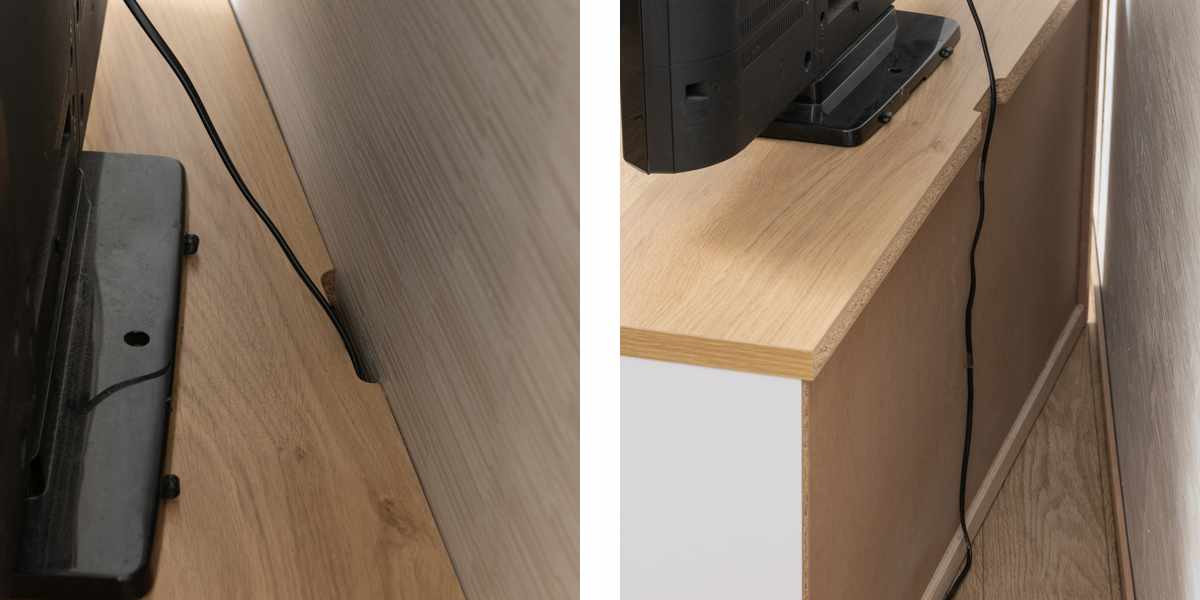 テレビ台としても使えるよう、天板にはコードを落とせる凹みが付いています。また、配線がしやすいように天板の後ろを約1cm出しているので、ぴったりと壁付けをしても線が邪魔になりません。