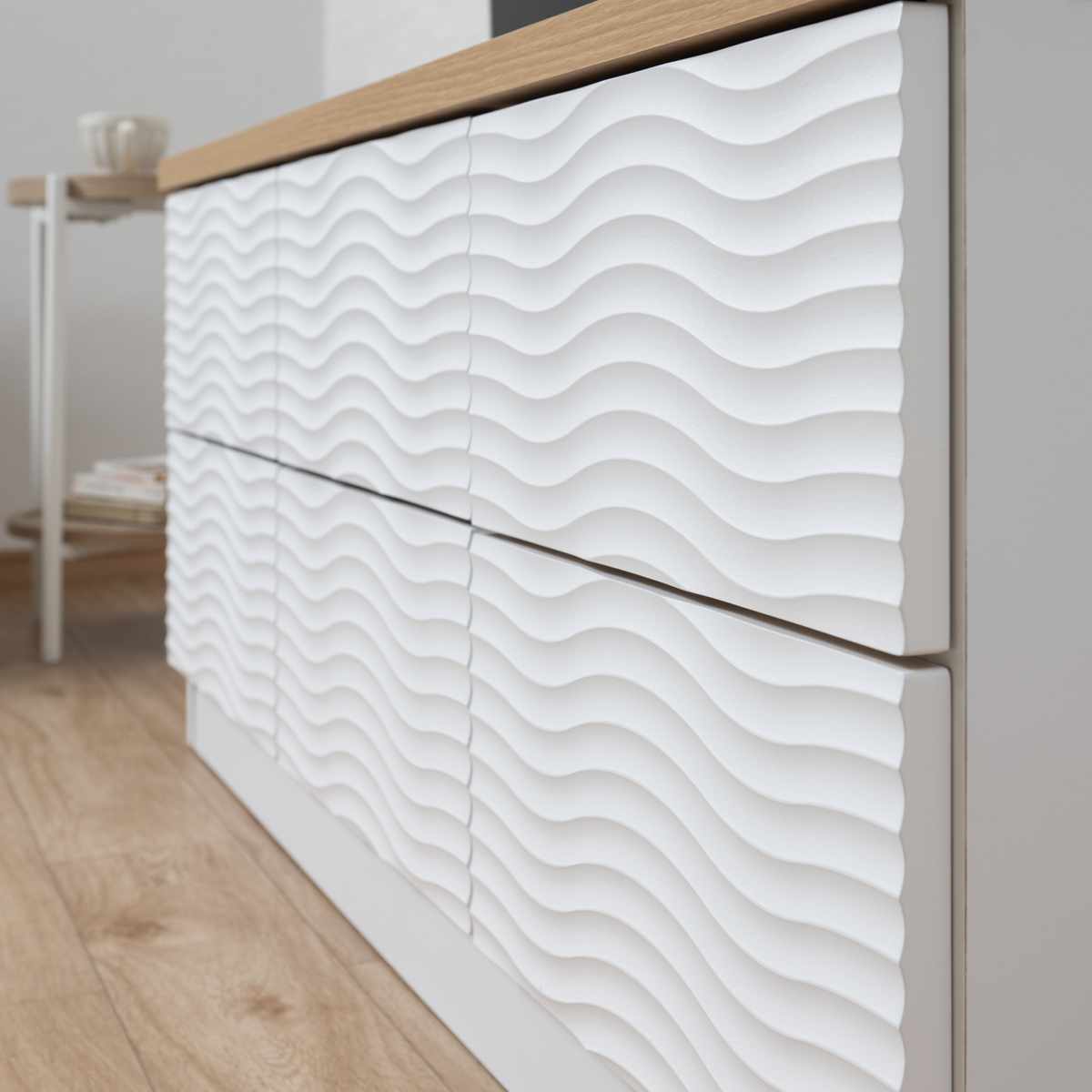 前面にウェーブ状の模様が入った、シンプルで高級感のある「WAVE」シリーズ。サイズ違いのオープンラックやチェストがあり、シリーズで揃えていただくと、統一感が出て、よりお洒落な空間を演出できます。