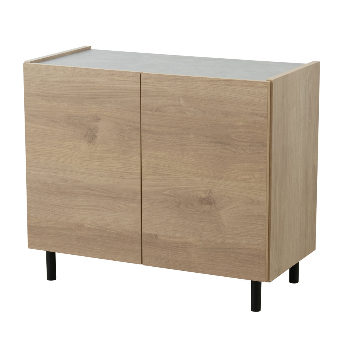 天然木に近い、リアルな木目を再現したシートを用いたキャビネットです。さらりとしたマットな手触りで悪目立ちせず、居心地の良い空間を作り上げます。ブラックカラーの天然木脚がさりげないアクセントに。
