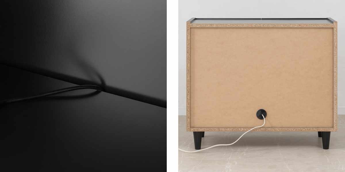 | 配線に便利な設計 それぞれの棚板の後ろに1cmの隙間があるので、ルーターや充電器などの配線を後ろに通すことができます。 | コード穴付き コード穴が背板に付いているので、配線を背面に逃がし、スッキリさせることができます。コード穴には、ほこりよけのゴムプッシュが付いています。 |