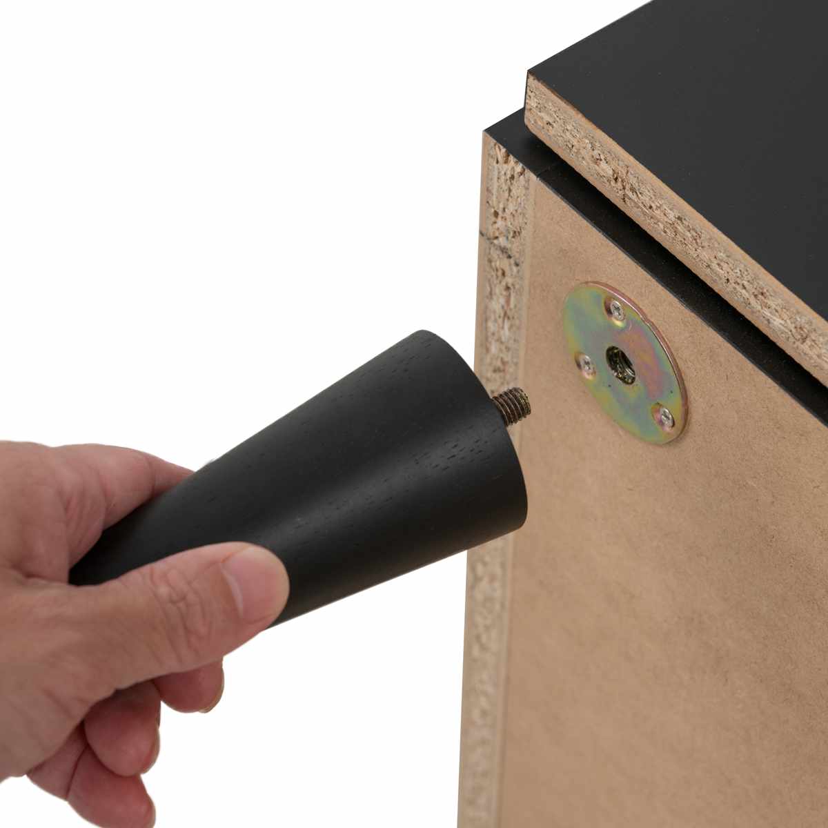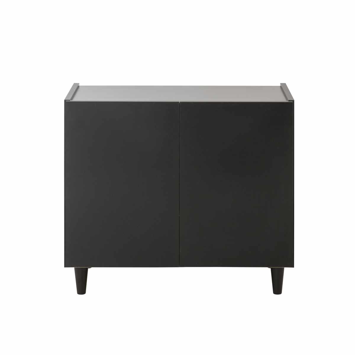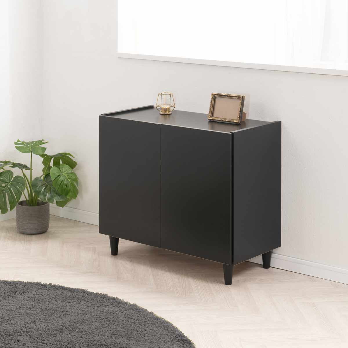 オールブラックで仕上げられた、存在感放つお洒落なキャビネットです。スッキリとしたシンプルなデザインとモノトーンな雰囲気で、お部屋をシックにカッコよく演出してくれます。軽やかな表情を追求した円すい形の木製脚が重厚感を和らげます。