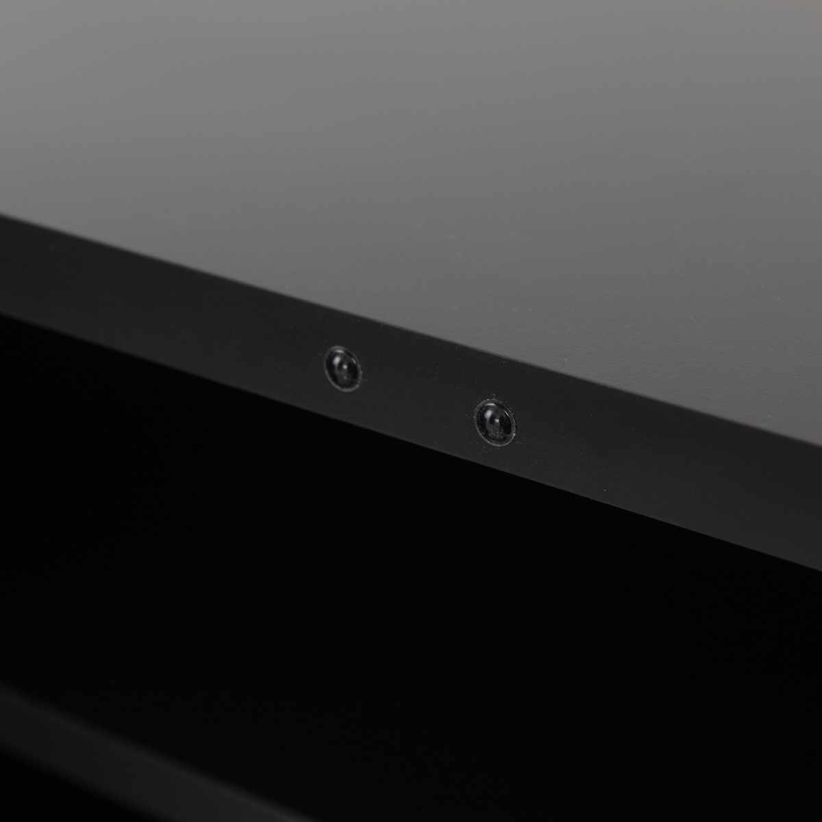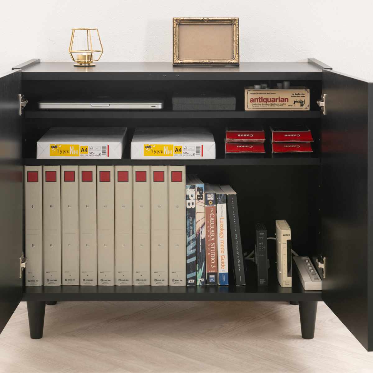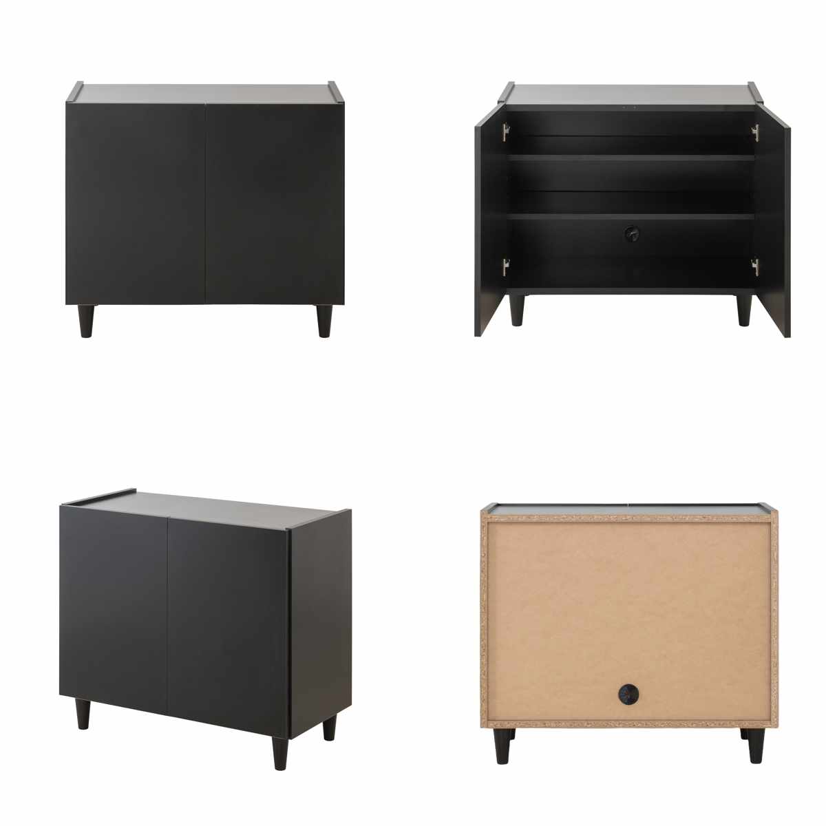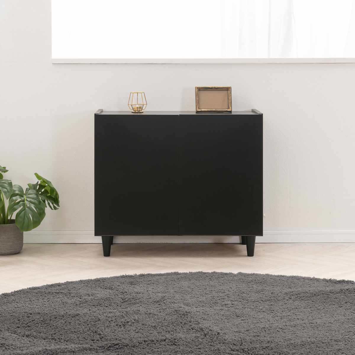 オールブラックで仕上げられた、存在感放つお洒落なキャビネットです。スッキリとしたシンプルなデザインとモノトーンな雰囲気で、お部屋をシックにカッコよく演出してくれます。軽やかな表情を追求した円すい形の木製脚が重厚感を和らげます。
