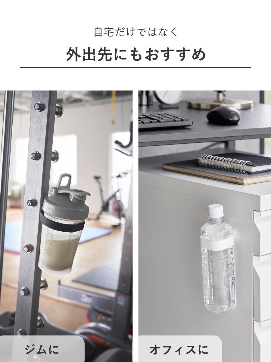 ジムでトレーニング中、置き場に困るプロテインボトルや、デスク周りでの水筒等も浮かせて収納できます。