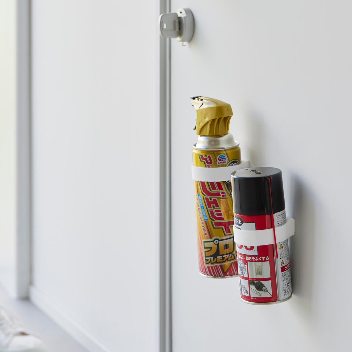 シリコーン製のバンドを付けるだけの簡単取り付けです。直径6~8cmまでのボトル・スプレー缶などに対応しています。