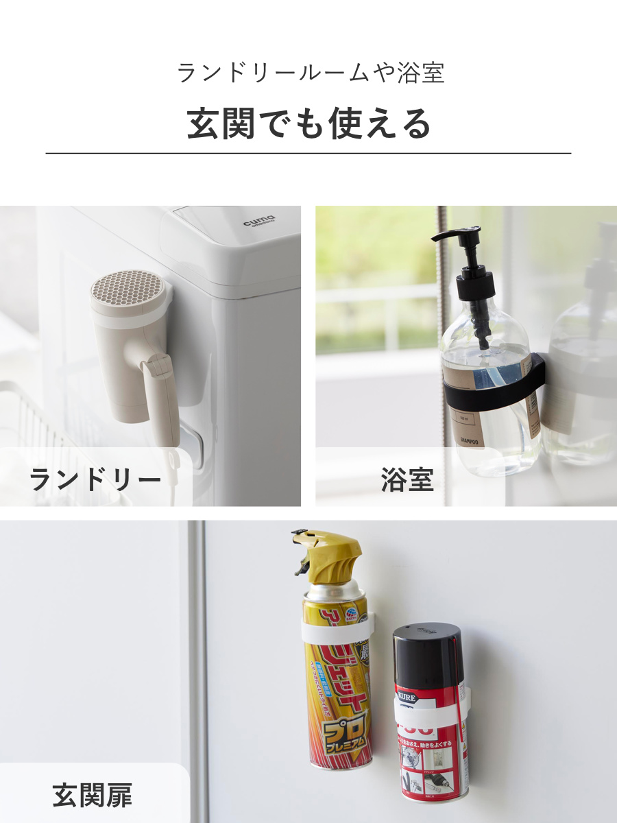 ランドリールームではドライヤー収納、浴室ではボトル収納にも使えます。防虫スプレー等を玄関ドアに取り付ける際にもおすすめです。