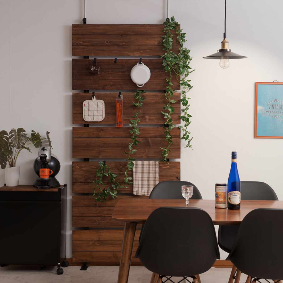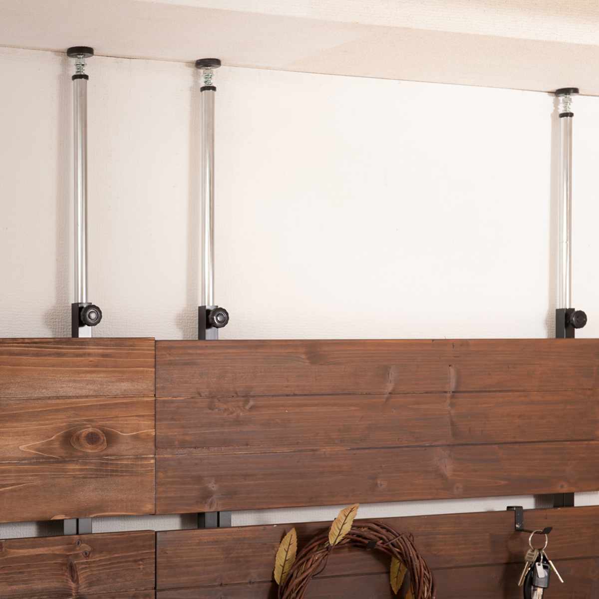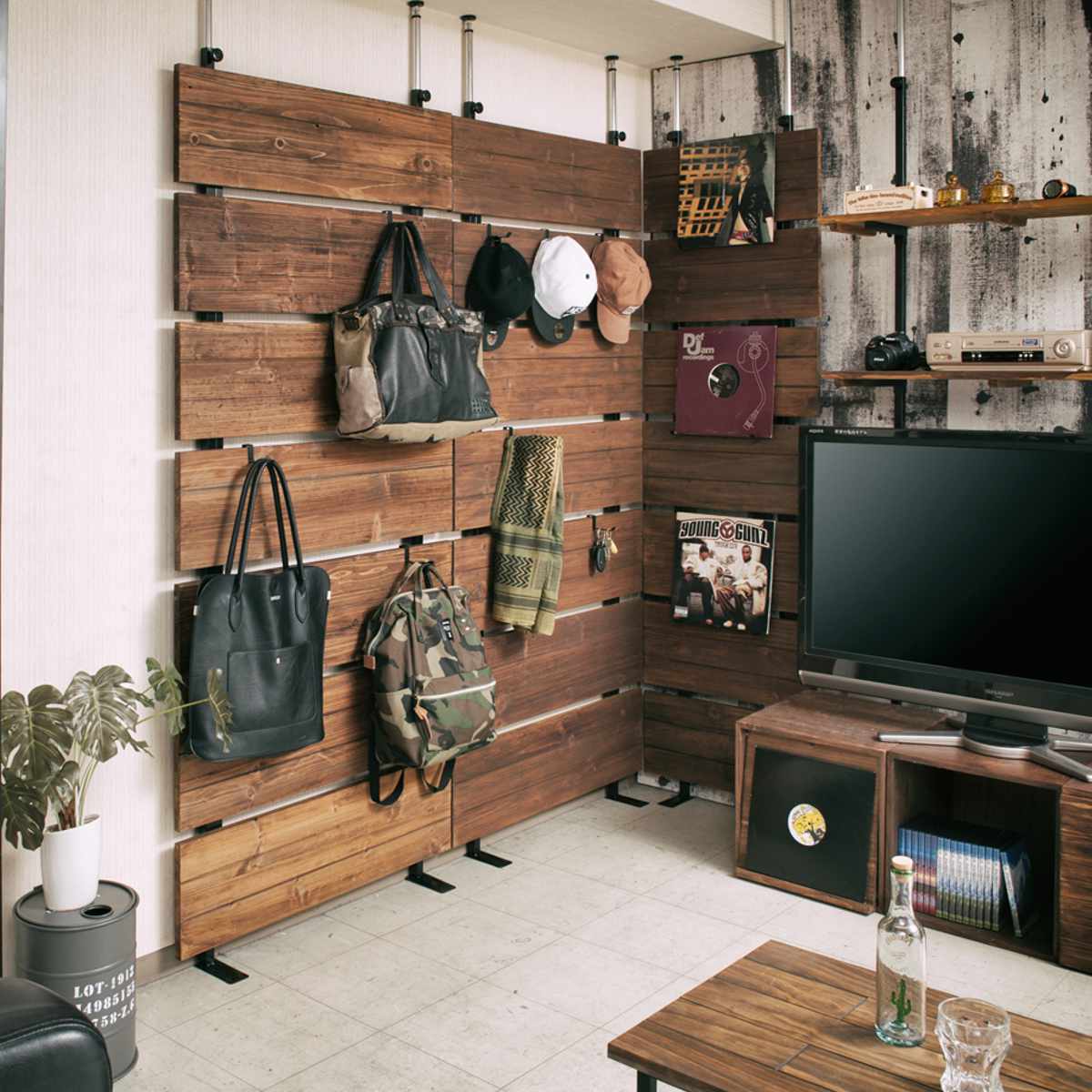 壁面収納ができる、突っ張り式のウォールパーテーションです。ヴィンテージ感漂うデザインで、見せる収納として服や小物、趣味の物などをお洒落に飾っていただけます。天井からの突っ張り式で、壁に穴を開ける必要がないので、賃貸にお住まいの方でも安心してご使用いただけます。