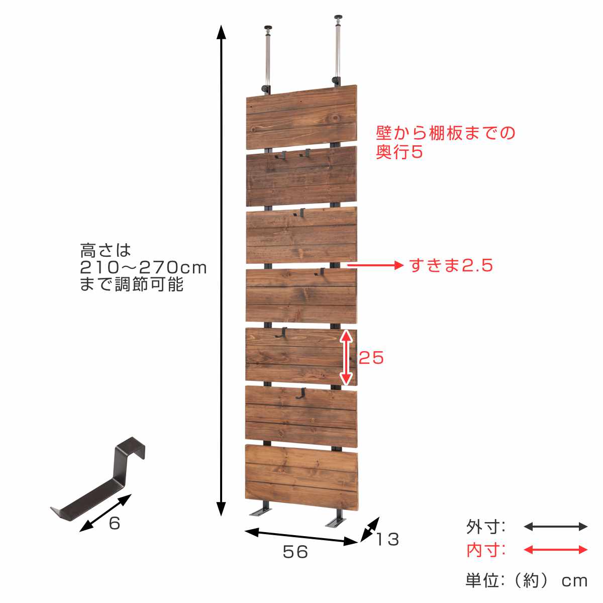 突っ張り ウォールパーテーション 幅56cm フック6個付 天然木 日本製 ( 壁面収納 ウォールラック つっぱり 突っ張り式 ラック フック付 壁面 収納 壁面ラック 突っ張りラック パーテーション 省スペース )